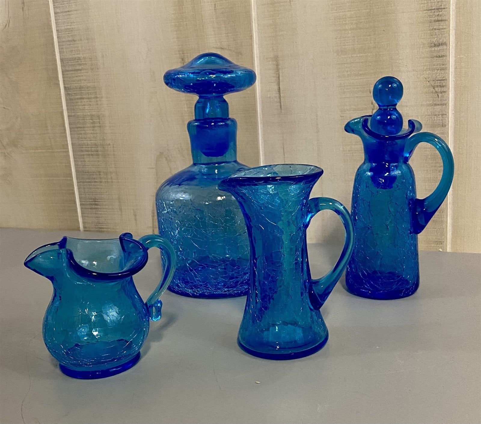 4 Misc. Pc. Vintage Unbranded Cobalt Blue Crackle Glass Pitcher and Decanter Set