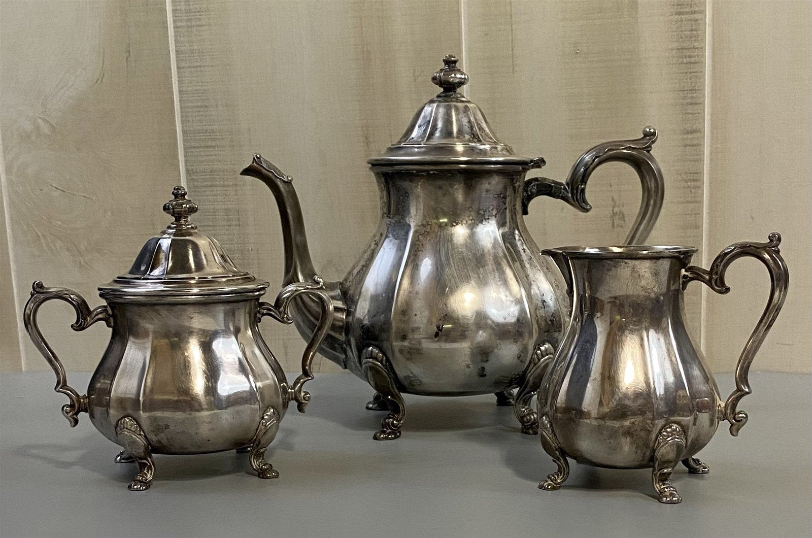 3pc. Antique Chippendale Silver Teapot, Creamer Pitcher, and Sugar Bowl Set