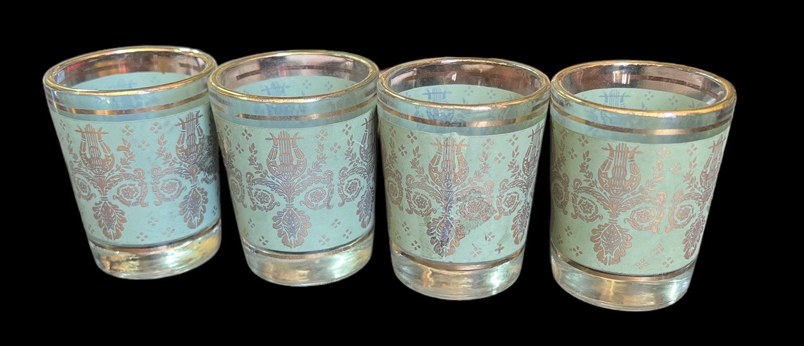 Shot Glass Sage Green and Gold Antique Jeannette Vintage Harp and Lyre Set of 4