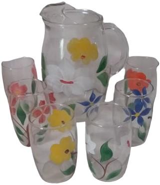 Antique Glass Pitcher with 6 Glasses Vintage Hand-Painted Colorful Flowers