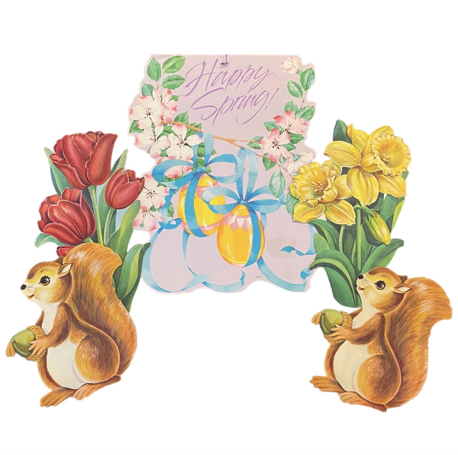 Spring Die Cut Posters Antique Squirrels Set of 2 Vintage Tulips Daffodils