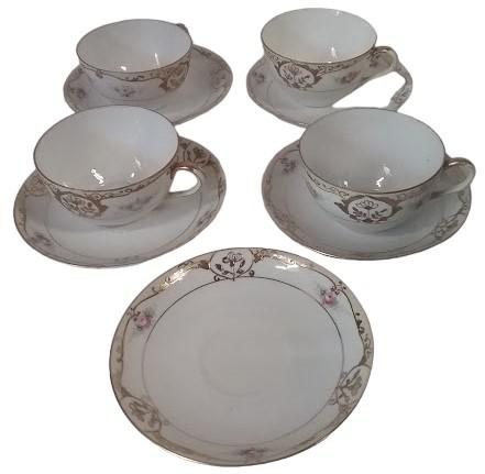 Antique Hand Painted Nippon Vintage Floral Design Bone China 4 Cups 5 Saucers