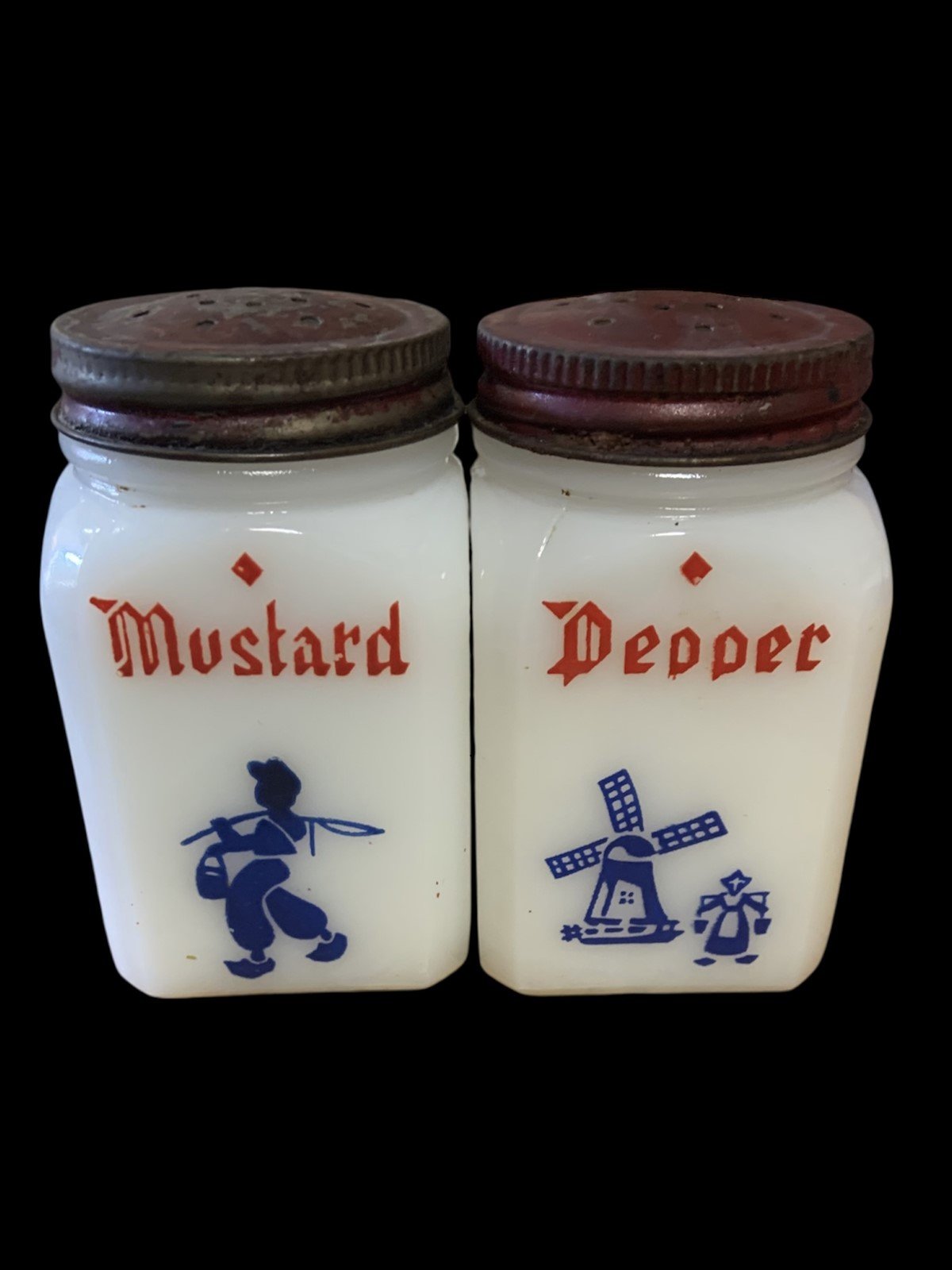 Tappan Mckee Pepper and Mustard Spice Jars Milk Glass Red Lid Vintage Pair
