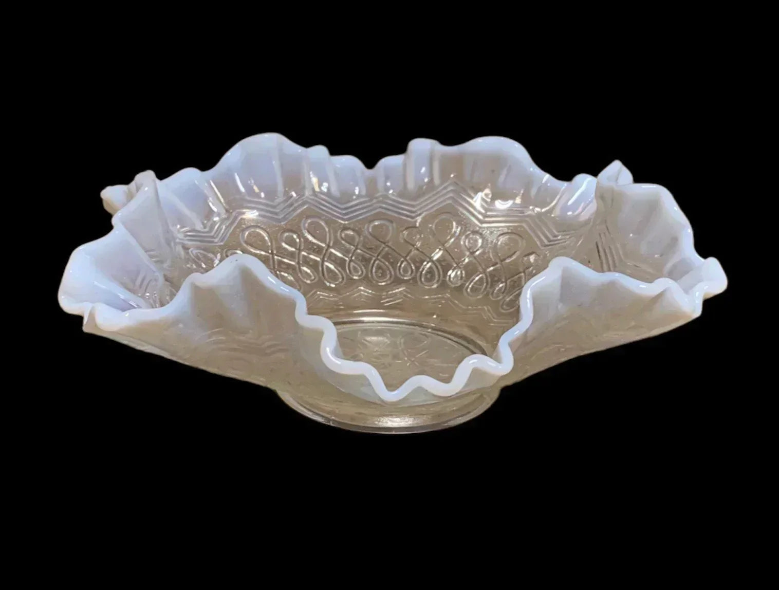 Antique Jefferson Glass Many Loops 8in White Opalescent Bowl Centerpiece 1900s