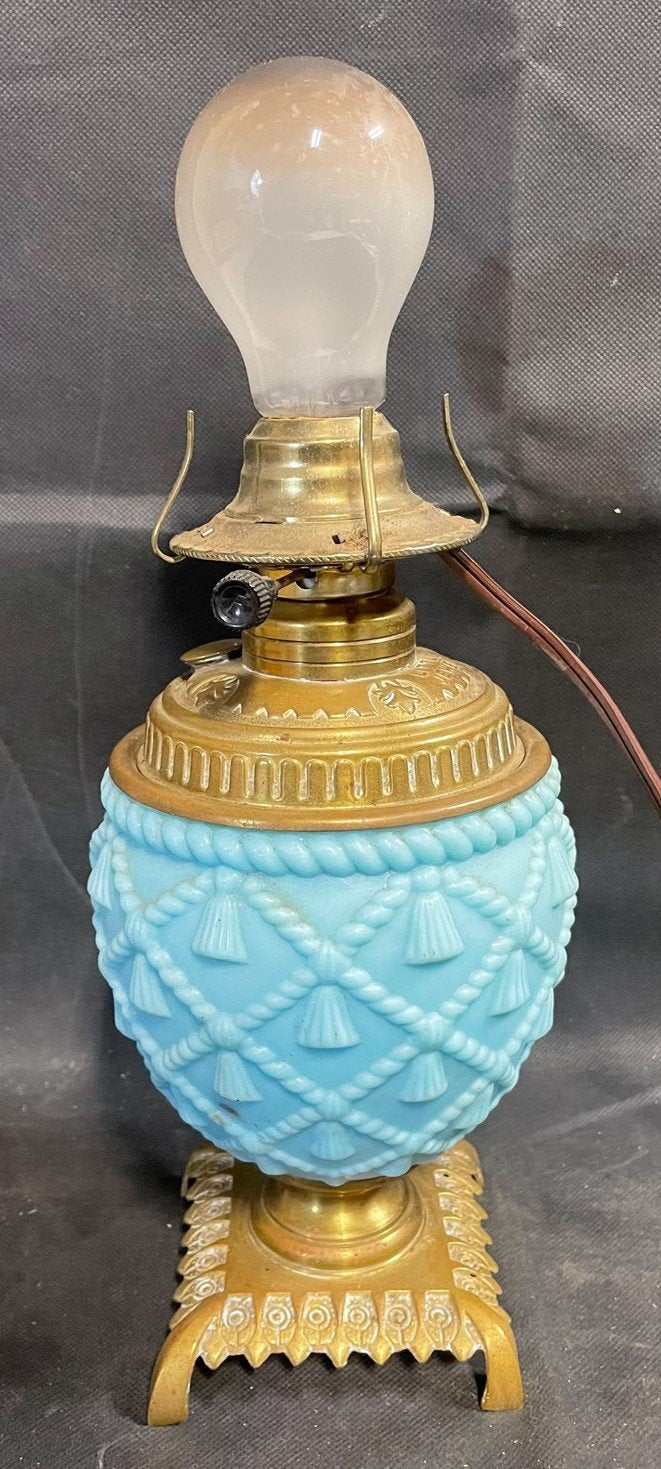 Vintage 12.5 inch Fostoria Baby Blue Milk Glass Cord Tassel Boudoir Table Lamp