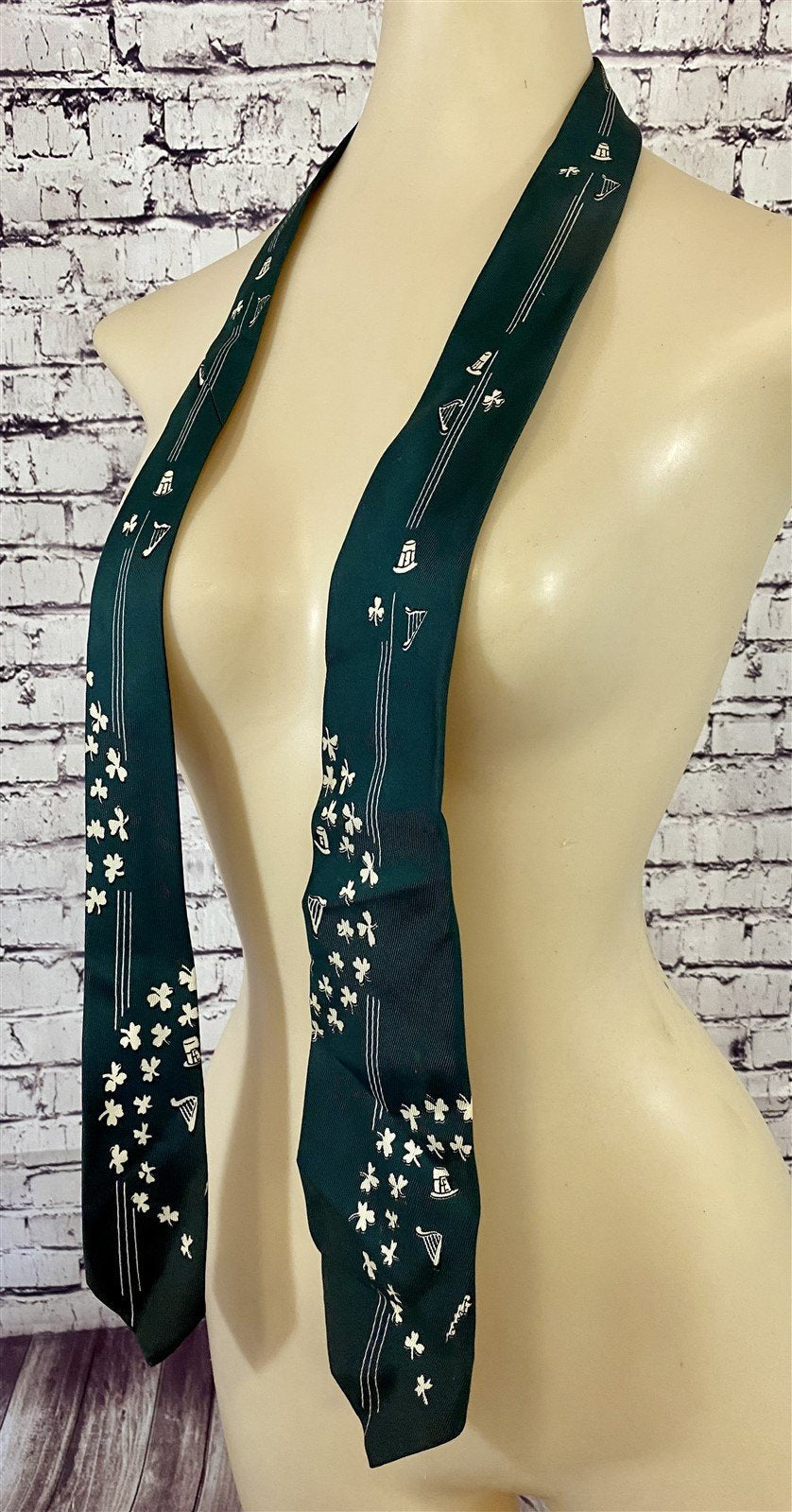 Vintage 1940s - 50s Irish Theme Silky Dark Green and White Necktie