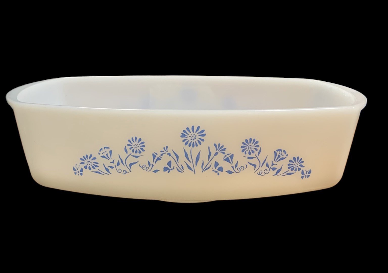 Vintage 1960 Federal Heat Proof Milk Glass Blue Corn Flower Pattern Baking Loaf