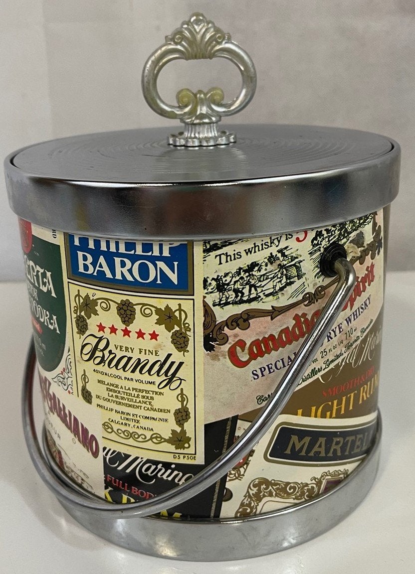 Vintage Alcoholic Brand Name Label Collage Chrome Ice Bucket