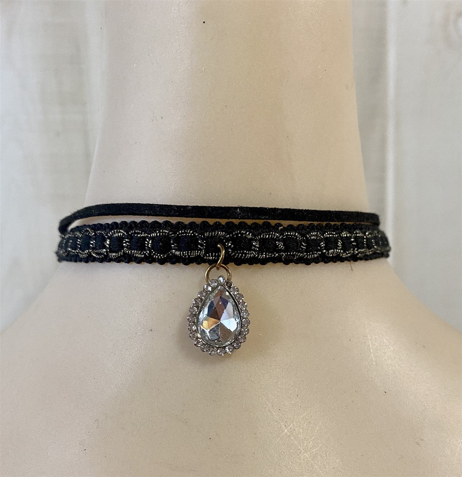 Vintage Black and Gold Pear / Tear Drop Rhinestone Stretchy Lobster Clasp Choker