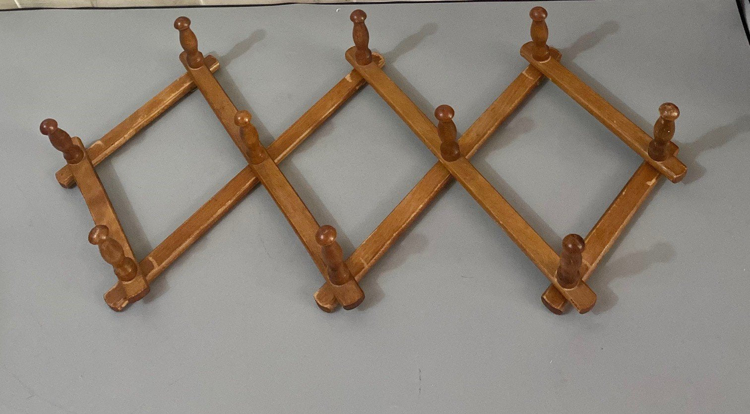 Vintage Boho Wood Accordion Wall Peg Rack w Original Sticker Kitchen King Japan