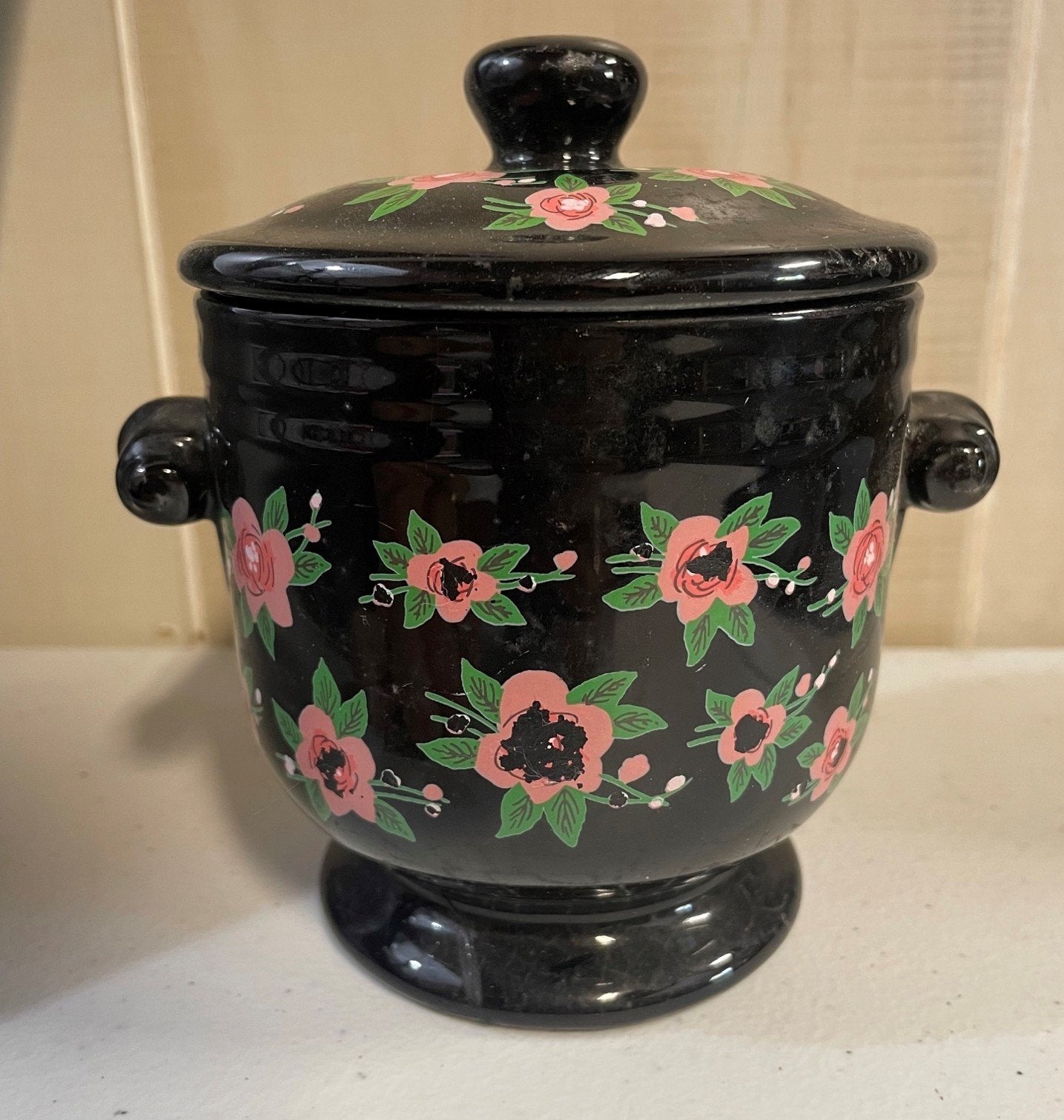Vintage Ceramic Black Floral Powder Canister Storage Container with Handles