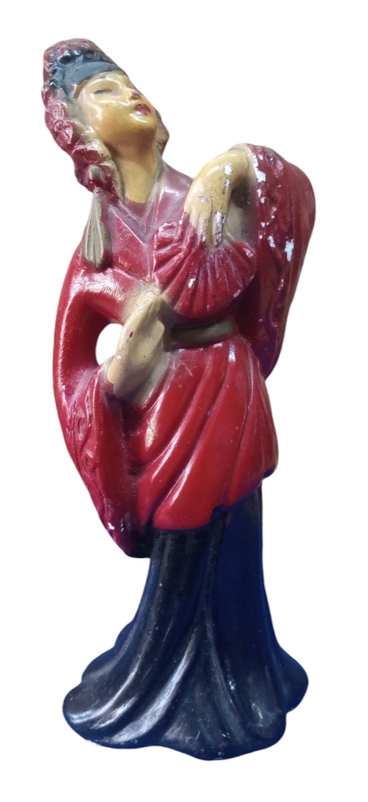 Vintage Glazed Red and Black Statue of Traditional Noble Chinese Woman With Fan