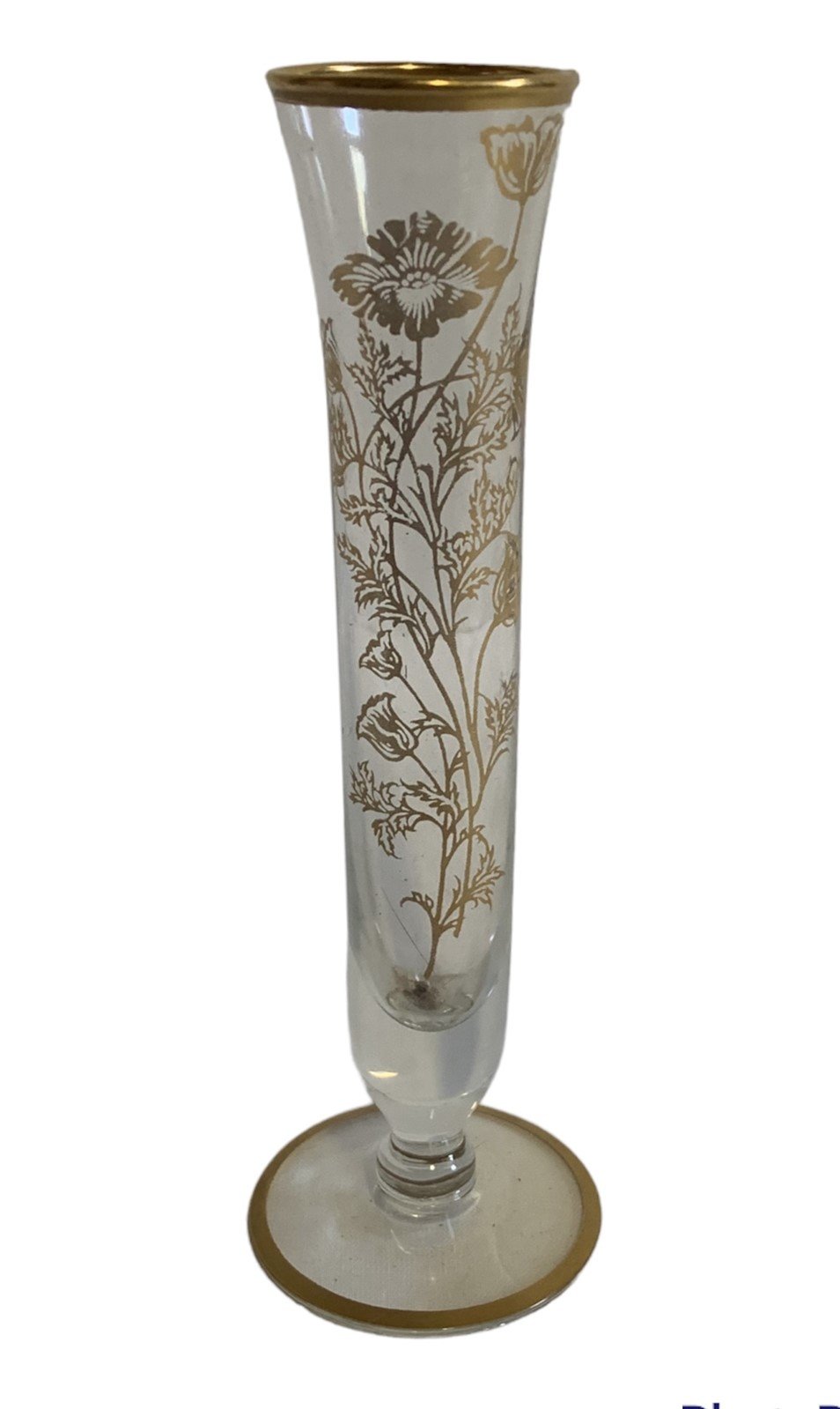 Vintage Gold Small Floral Print Glass Round Footed Bud Flower Vase