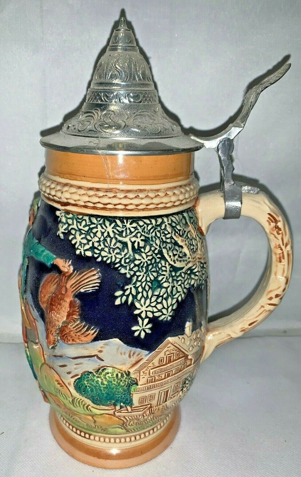 VINTAGE MADE IN GERMANY MAN HUNTING DEER AND TURKEY WIDE LIDDED STEIN