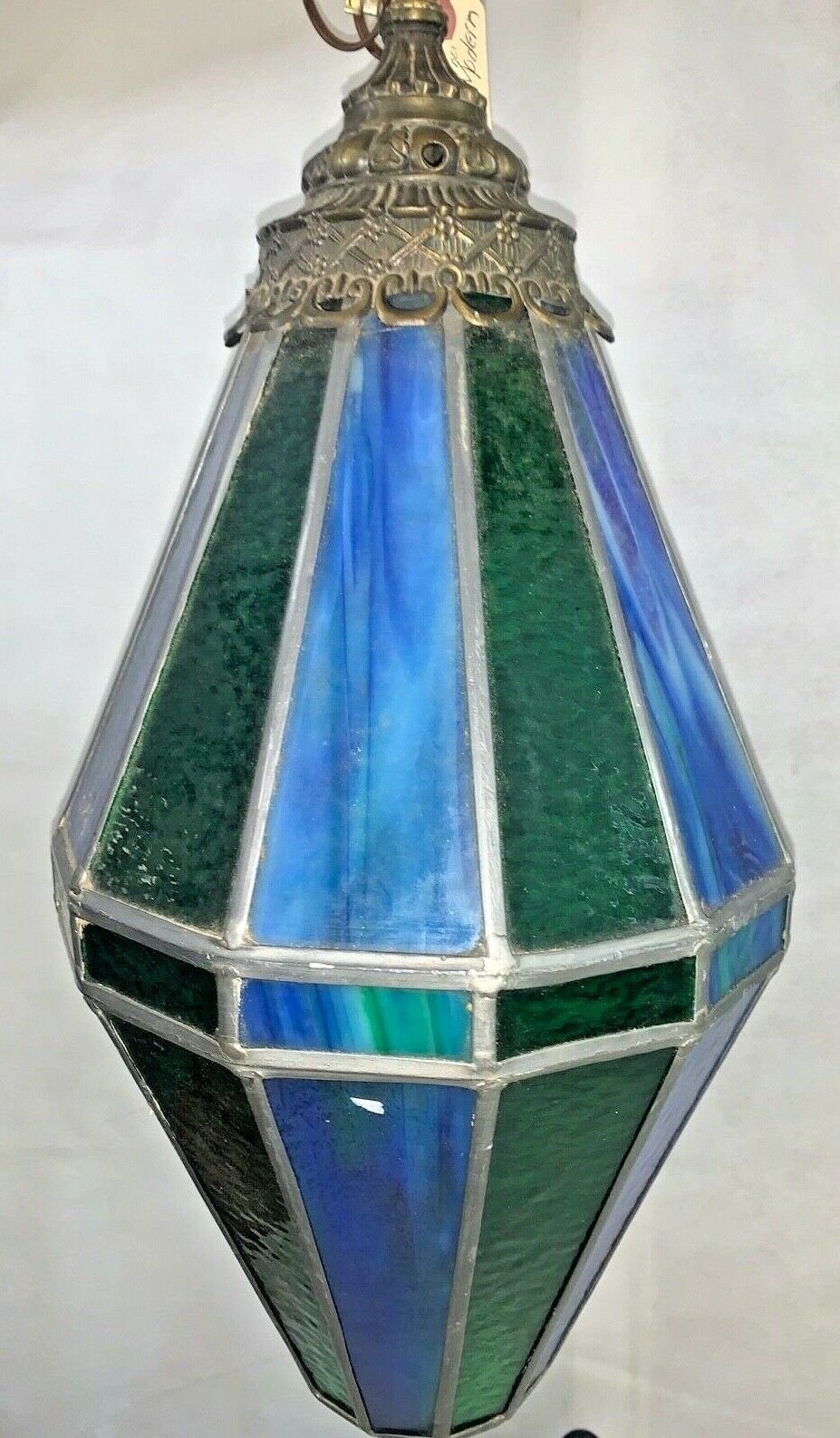 Vintage Mid Century Leaded Stained Slag Glass Diamond Hanging Light Lamp Fixture