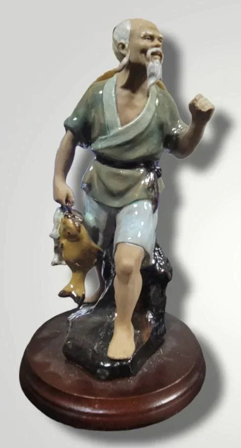 Vintage Shiwan Mud-man Glazed Clay Chinese Statue Of Fisherman