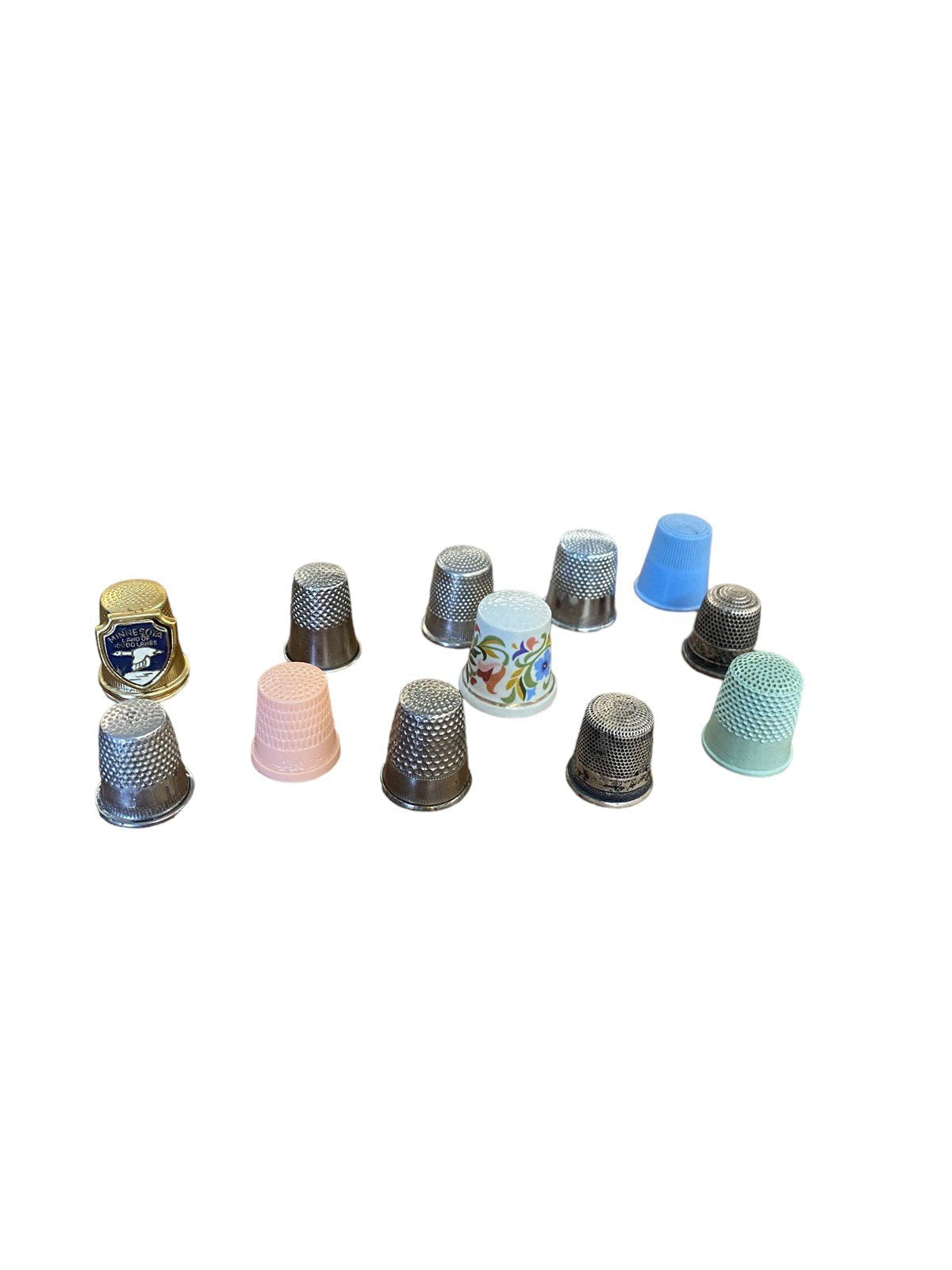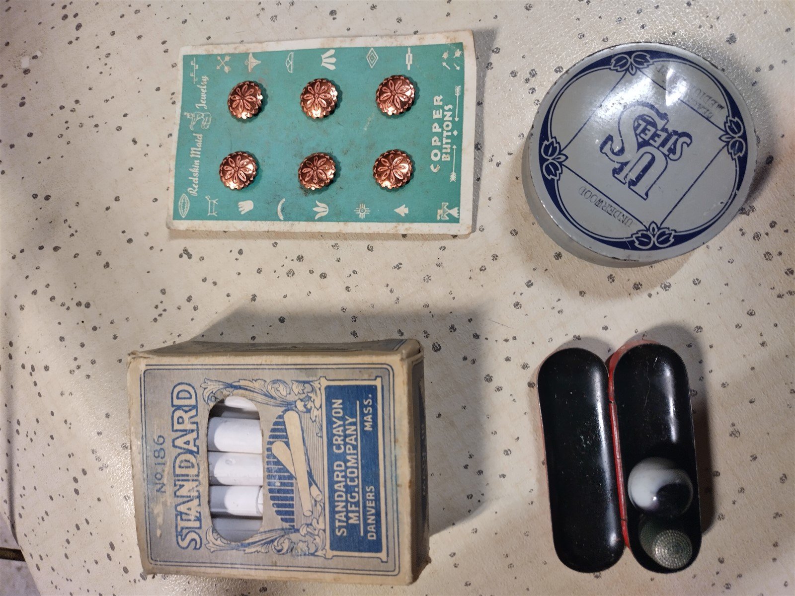 Vintage Sewing Supplies Copper Buttons Thimble Ribbon Containers MFG Chalk