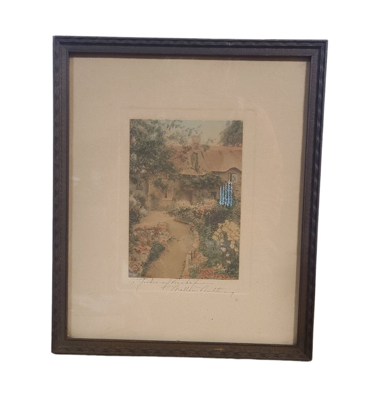 Vintage Signed Wallace Nutting Hand Tinted Watercolor Print Garden of Larkspur