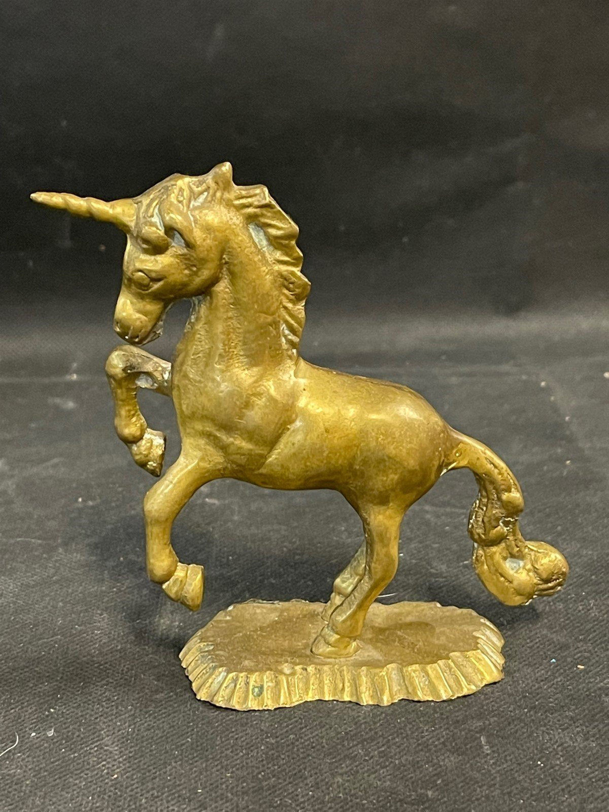 Vintage Small Solid Brass 4.5 inch Mythical Unicorn Rearing Up on Platform