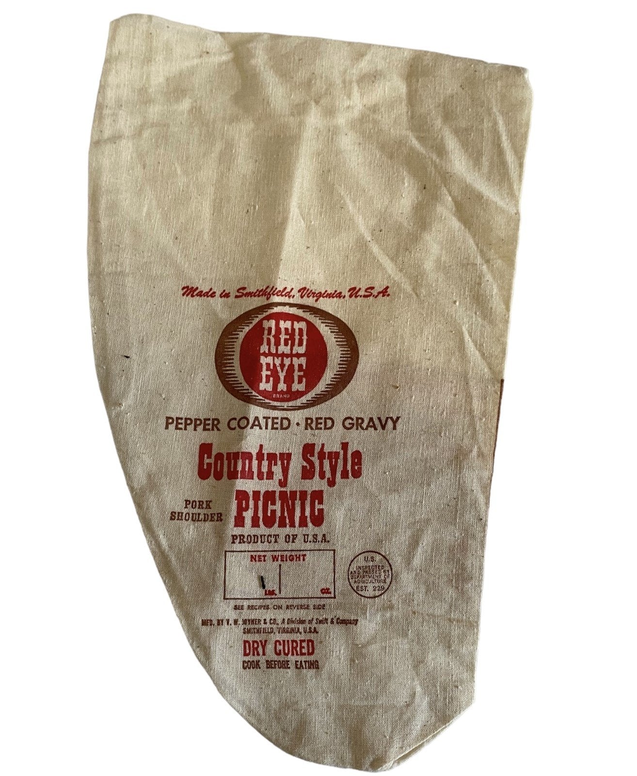 VINTAGE RED EYE BRAND COOKED COUNTRY STYLE HAM CLOTH BAG MADE IN SMITHFIELD VA