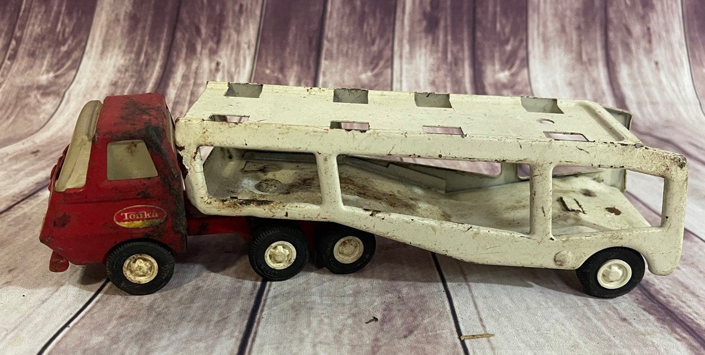 Vintage Red and White Pressed Metal Tonka Truck Car Carrier Hauler Transporter