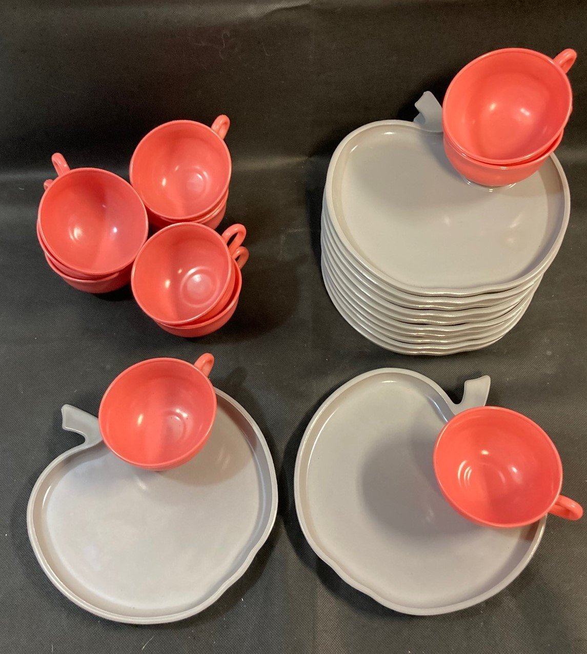 Vintage Rare Hazel Atlas Gray Milk Glass Apple Snack Plate w/ Pink Cup Set of 12