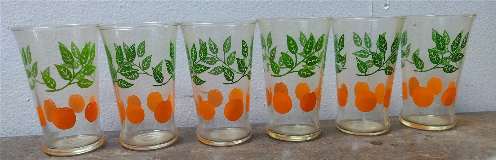 Vintage Set of 6 Mid Century Rim Clear Green Leaf Clear Orange Kitchen Glasses