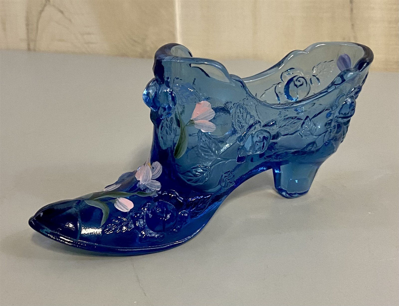 1991 Vintage Fenton Cobalt Blue Glass Hand Painted Floral Design Decorative Shoe