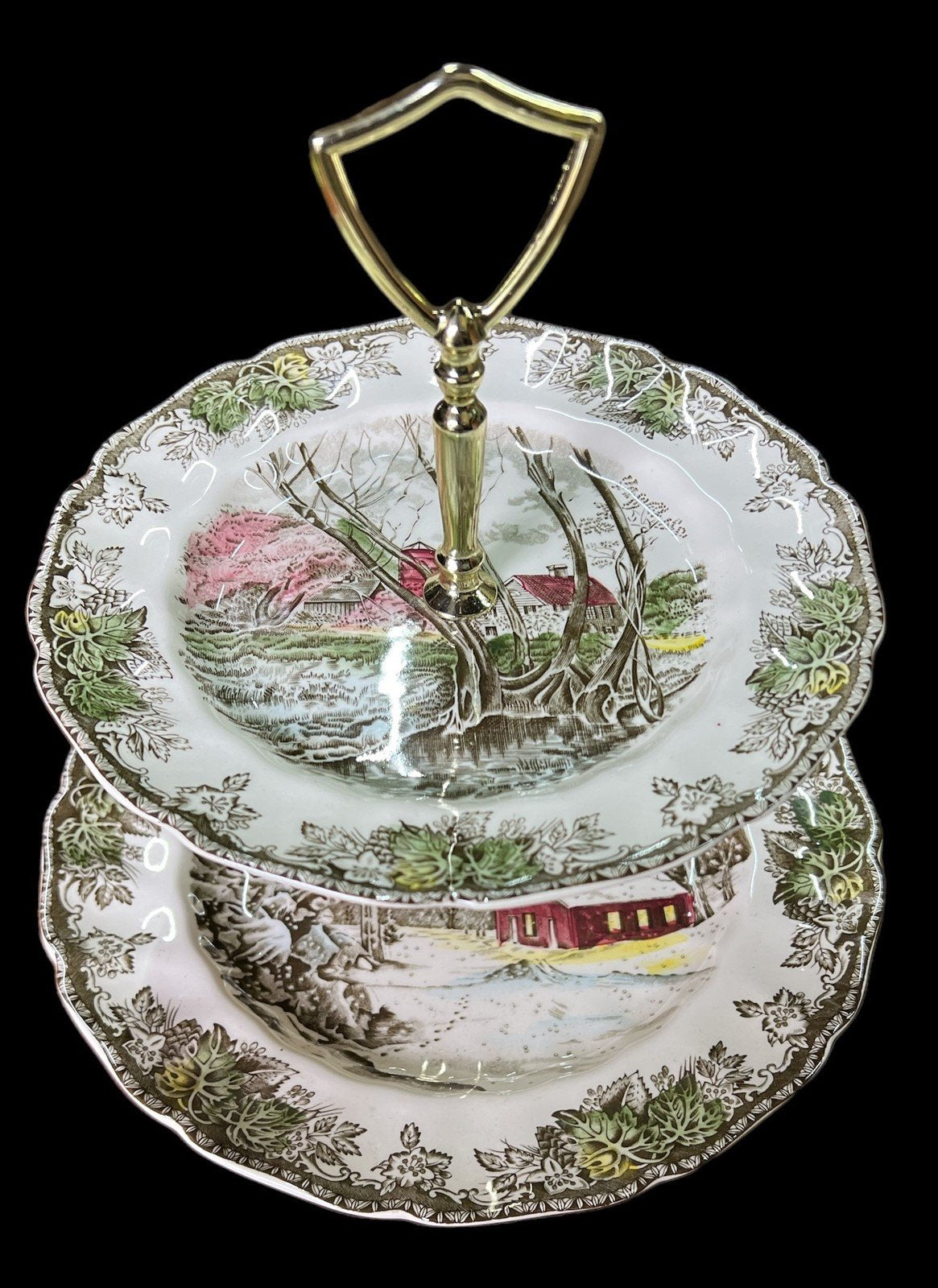 2-Tiered Serving Tray Antique Johnson Bros Vintage Friendly Village School House