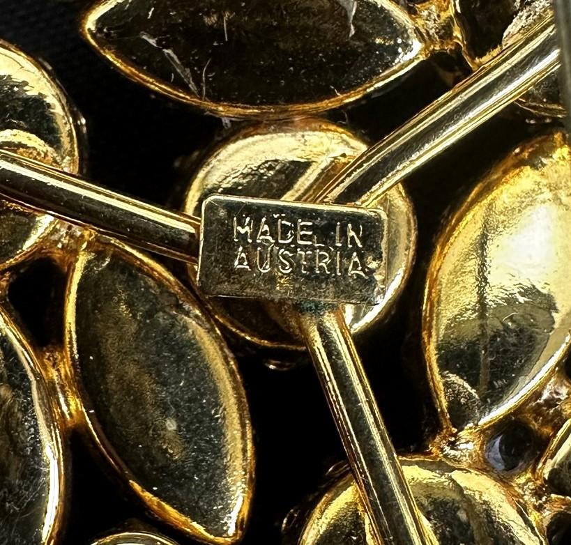 This blue obsidian domed rhinestone brooch features different shades of blue rhinestones in chaton + navette stones in multiple sizes. Each rhinestone has its own prong set. The brooch measures about 2in x 2in and is in mint condition. This brooch was made in Austria and features an either gold-toned or gold-plated back.