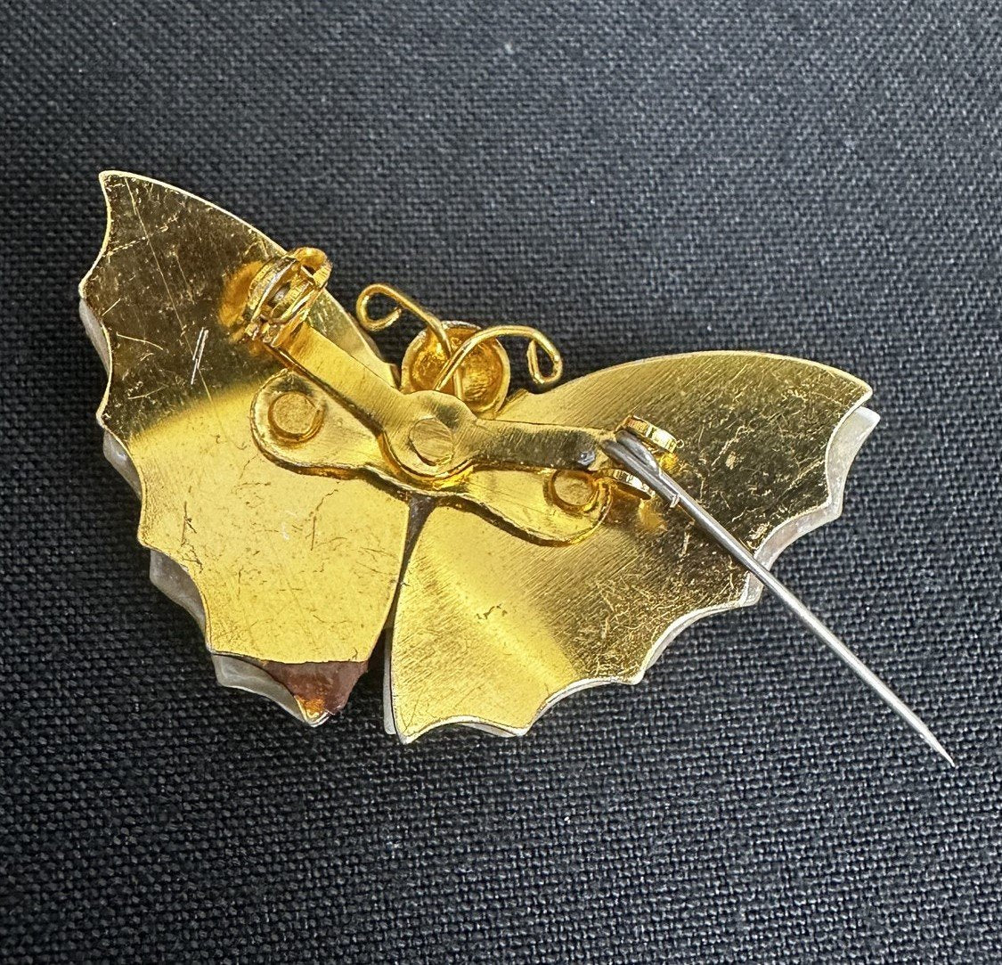 Handmade vintage marbled green seashell butterfly brooch, made with a real seashell and gold-toned metal. This brooch is in good condition, there are some scratches in the metal and some glue spillage from when it was made. The seashell used is a marble of green, white, and brown. This brooch measures about 1.7in wide and about 1in long.