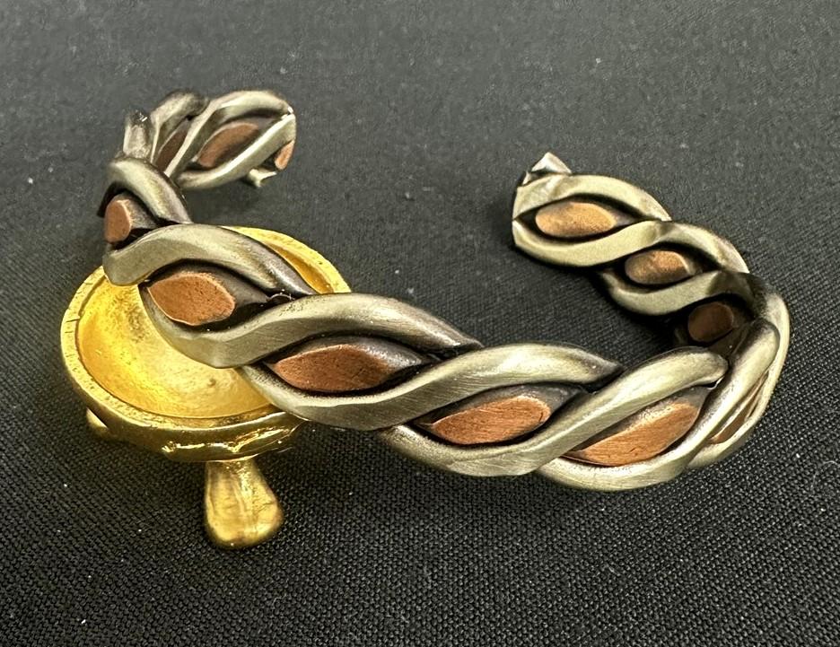 Two-Toned Silver and Copper colored twisted metal cuff bracelet in great condition. There is some signs of wear along the copper colored metal but it adds to the brutalist look of it.