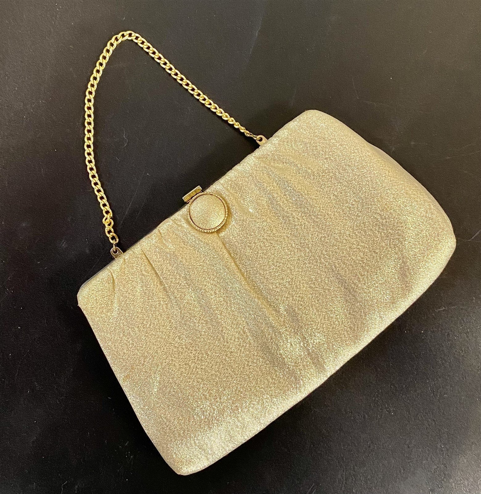Vintage Gold Lamé Formal Clutch Evening Handbag Purse with Tuckable Wrist Chain