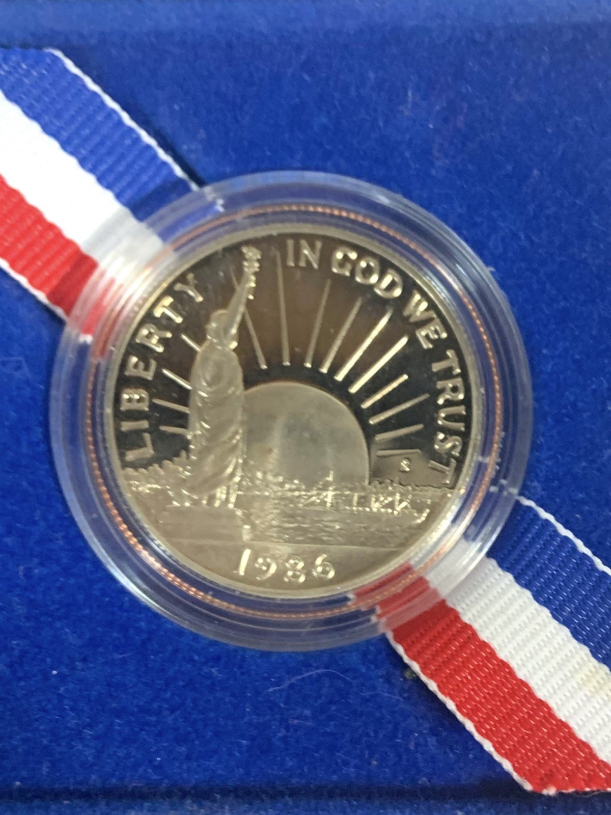 1986 Half Dollar Coin in the Official US Mint Box. Coin features The Statue of Liberty, and says "In God We Trust". This commemorative coin was made to celebrate the 100th Birthday of the Statue of Liberty. Box is 3.5" x 2.75" x .5".Take a look at the pictures for the best description. A photo is as good as a thousand words and is the best description of cosmetic condition. Use your ZOOM TOOL to best see this item! Please look closely at the photos for condition answers.