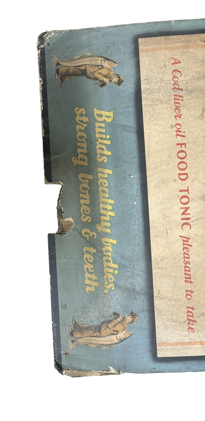 Awesome Antique Cardboard Advertisement for Scott's Emulsion Fortified Cod Liver Oil. This ad is super cool, features such an interesting design! Measures 19" x 30". Condition is as shown.Take a look at the pictures for the best description. A photo is as good as a thousand words and is the best description of cosmetic condition. Use your ZOOM TOOL to best see this item! Please look closely at the photos for condition answers.