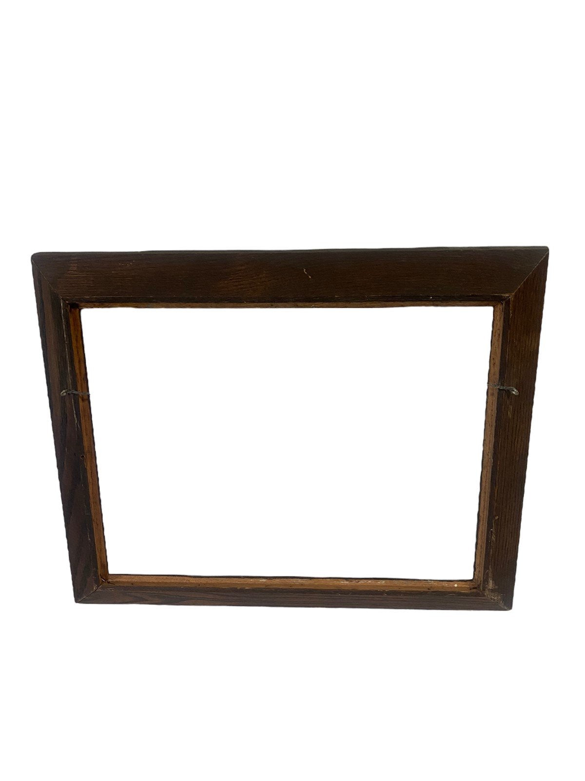 Antique Oak wood stained empty picture frame. Item is 20" long and 16" wide, the inside of the frame is 16" long and 12" wide. Item is in used condition, with some minor scratches throughout. Some wood restore and light sanding will enhance the wood beauty on this piece. Would look nice on a gallery wall with some cool art work in it!Take a look at the pictures for the best description. A photo is as good as a thousand words and is the best description of cosmetic condition. Use your ZOOM TOOL to best see this item! Please look closely at the photos for condition answers.
