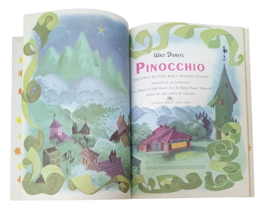 This is a set of vintage Big Golden Books all published in the 1950s. Marks and scratches are visible as well as minor stains. This set is great for any aspiring collector and is perfect for filling out your home library! Each book measures about 12" by 9" by 0.5". This set includes Disney's Pinocchio (1953) Disney's Lady & The Tramp (1955) Lassie Finds A Way (1957) Three Bedtime Stories (1958)