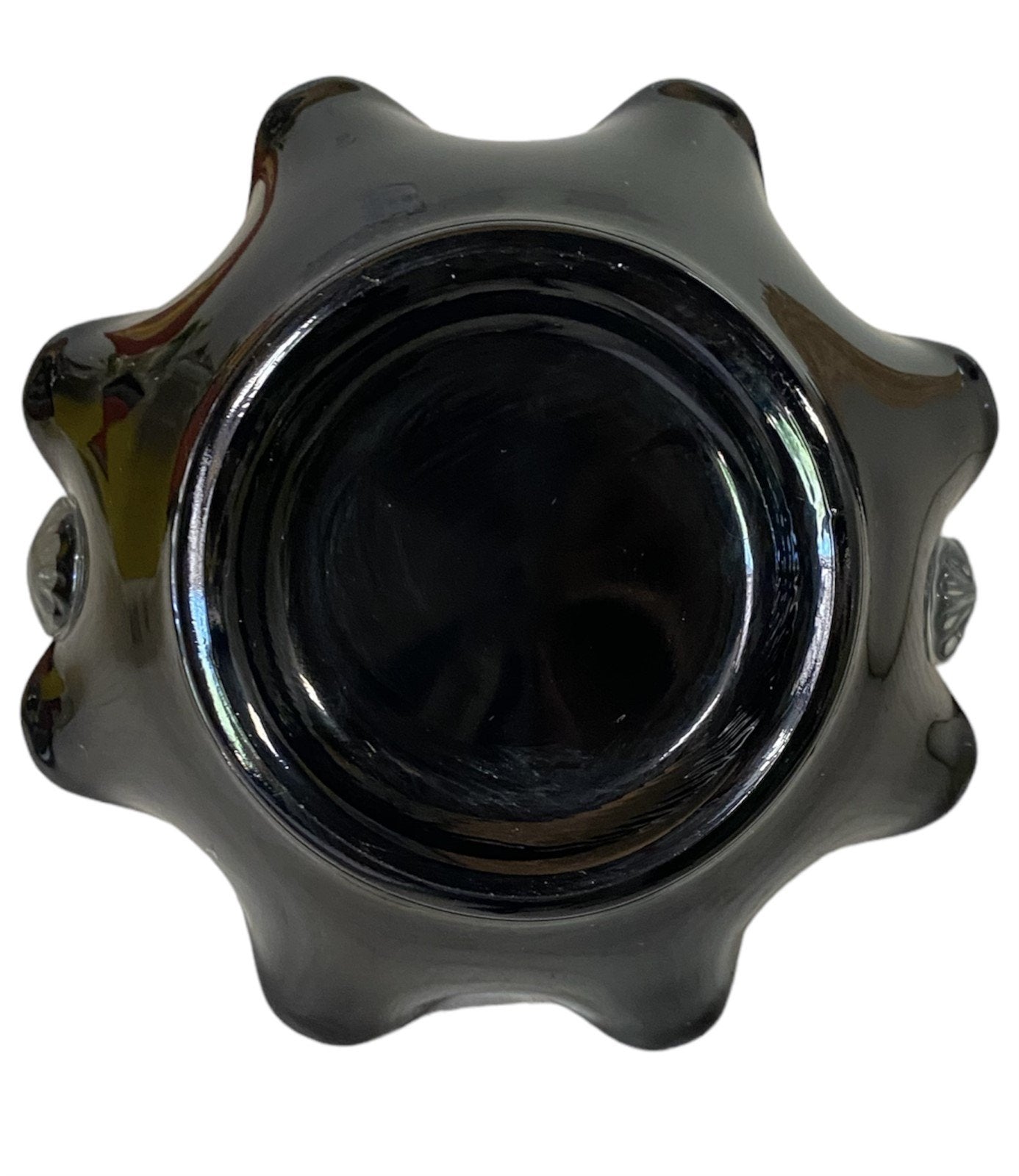 This black ruffled glass basket is gorgeous! The handle is clear and the basket is in excellent condition! Don't miss out on this perfect addition to your home/office! This basket is 5in x 5 1/2in x 5in.Take a look at the pictures for the best description. A photo is as good as a thousand words and is the best description of cosmetic condition. Use your ZOOM TOOL to best see this item! Please look closely at the photos for condition answers.