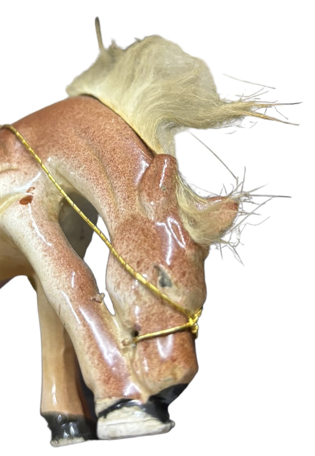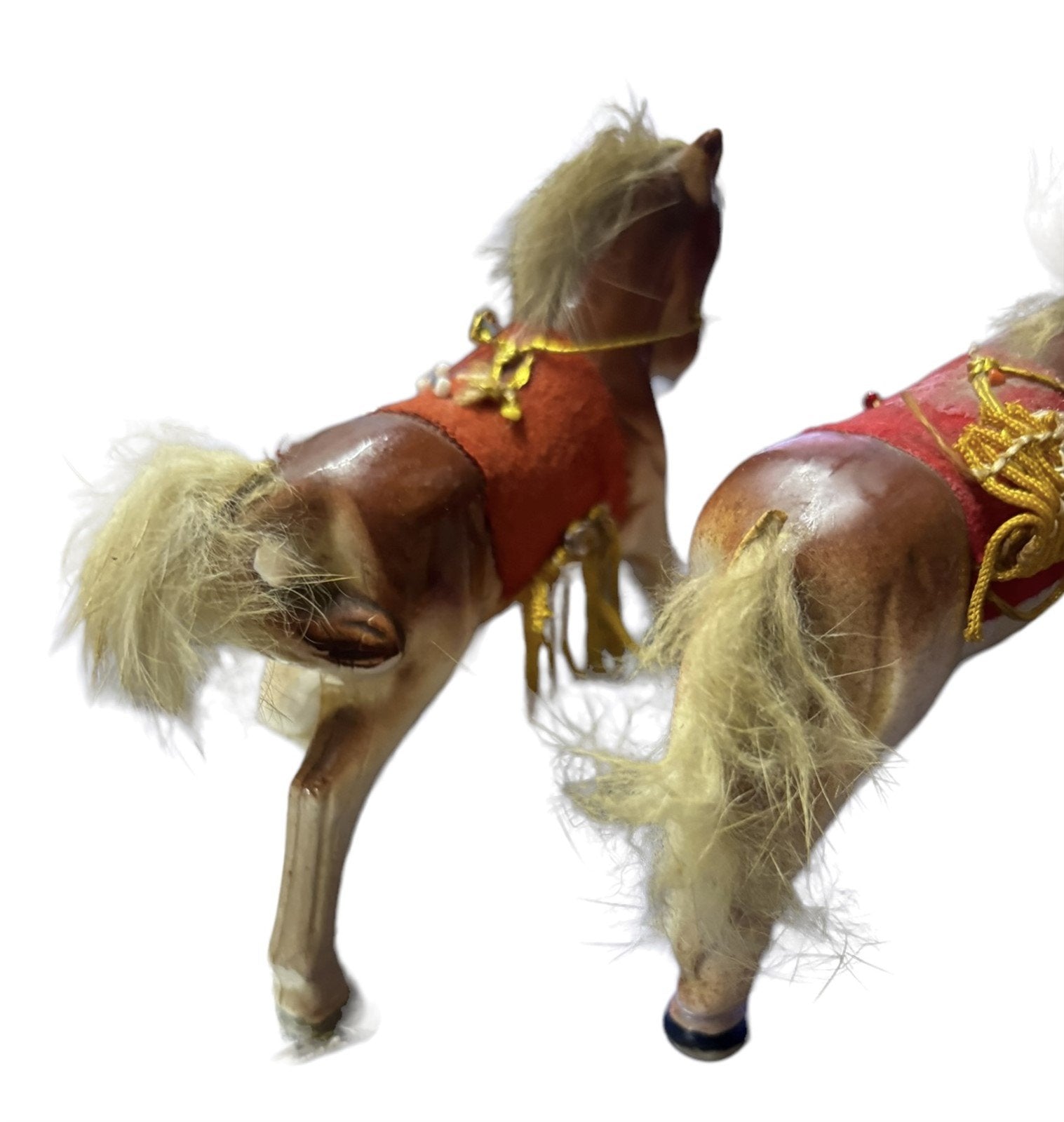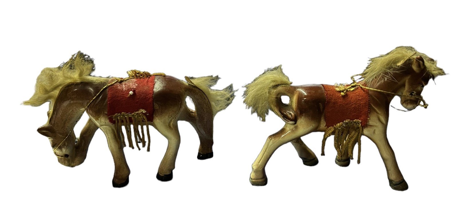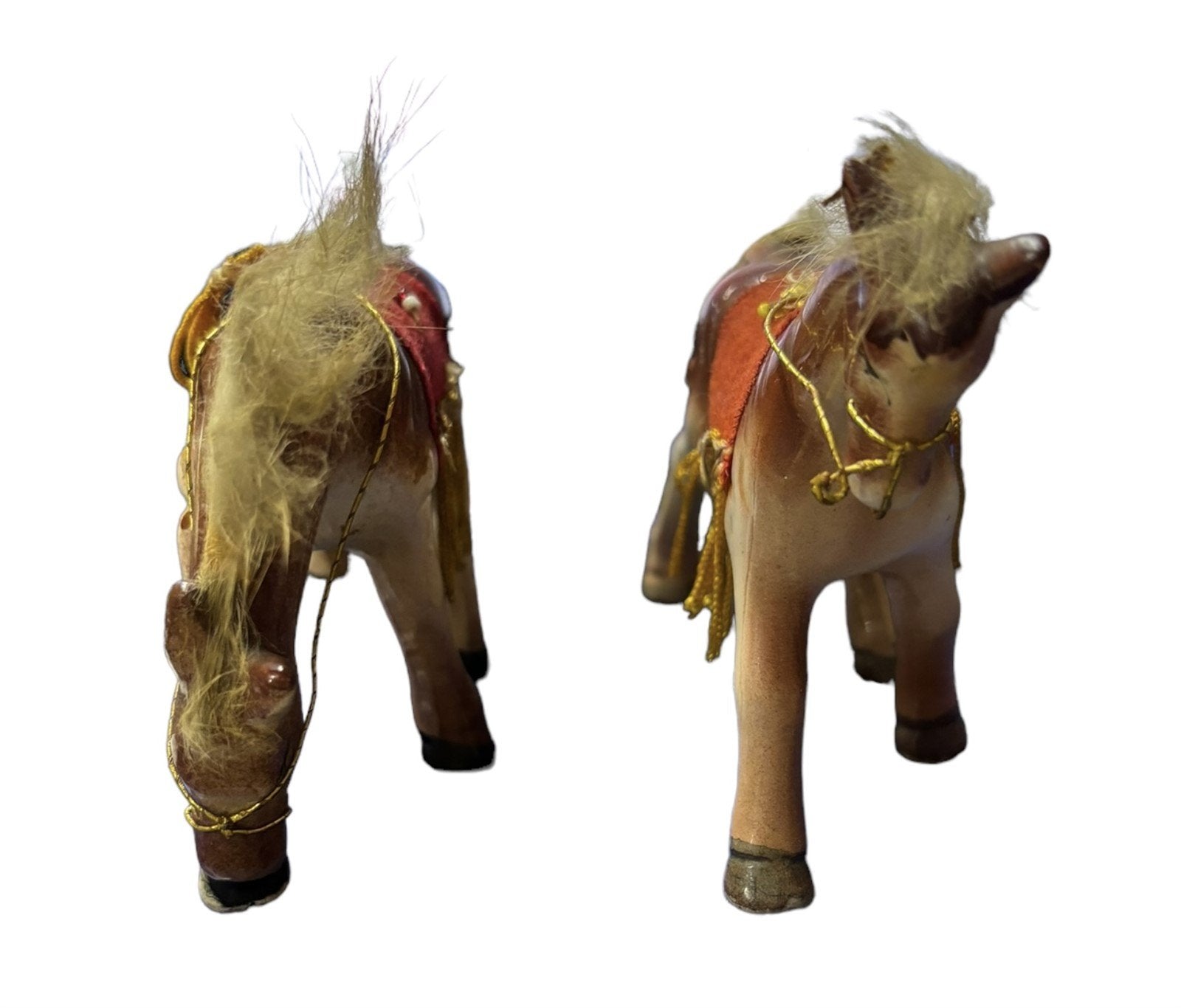 Bone China Horses Pair Red Saddle Rabbit Fur Mane and Tail Ceramic Figures