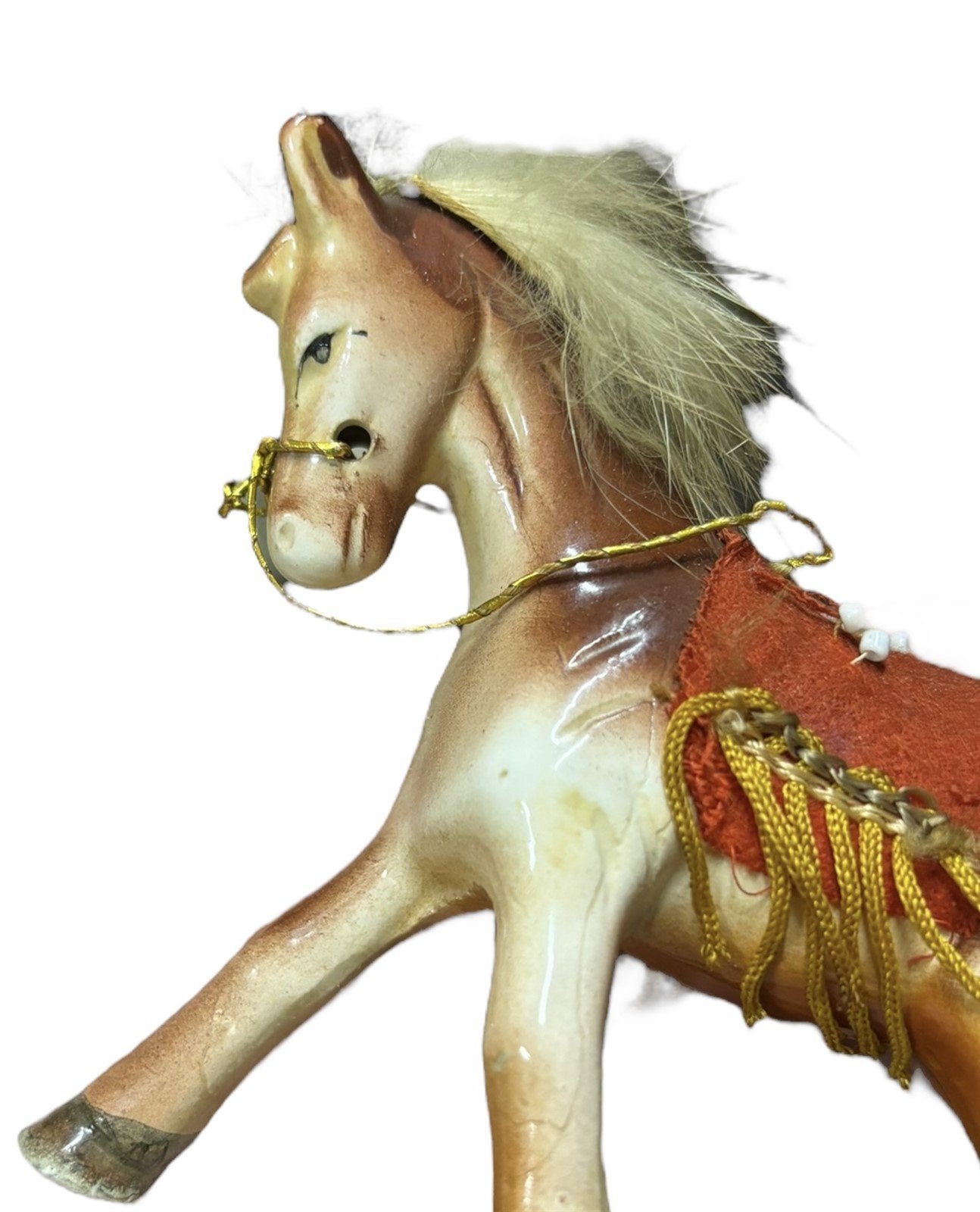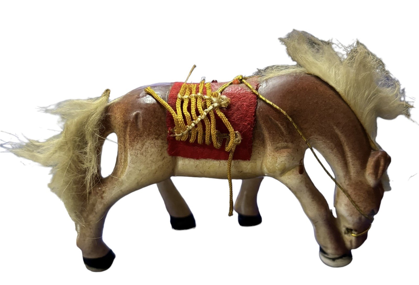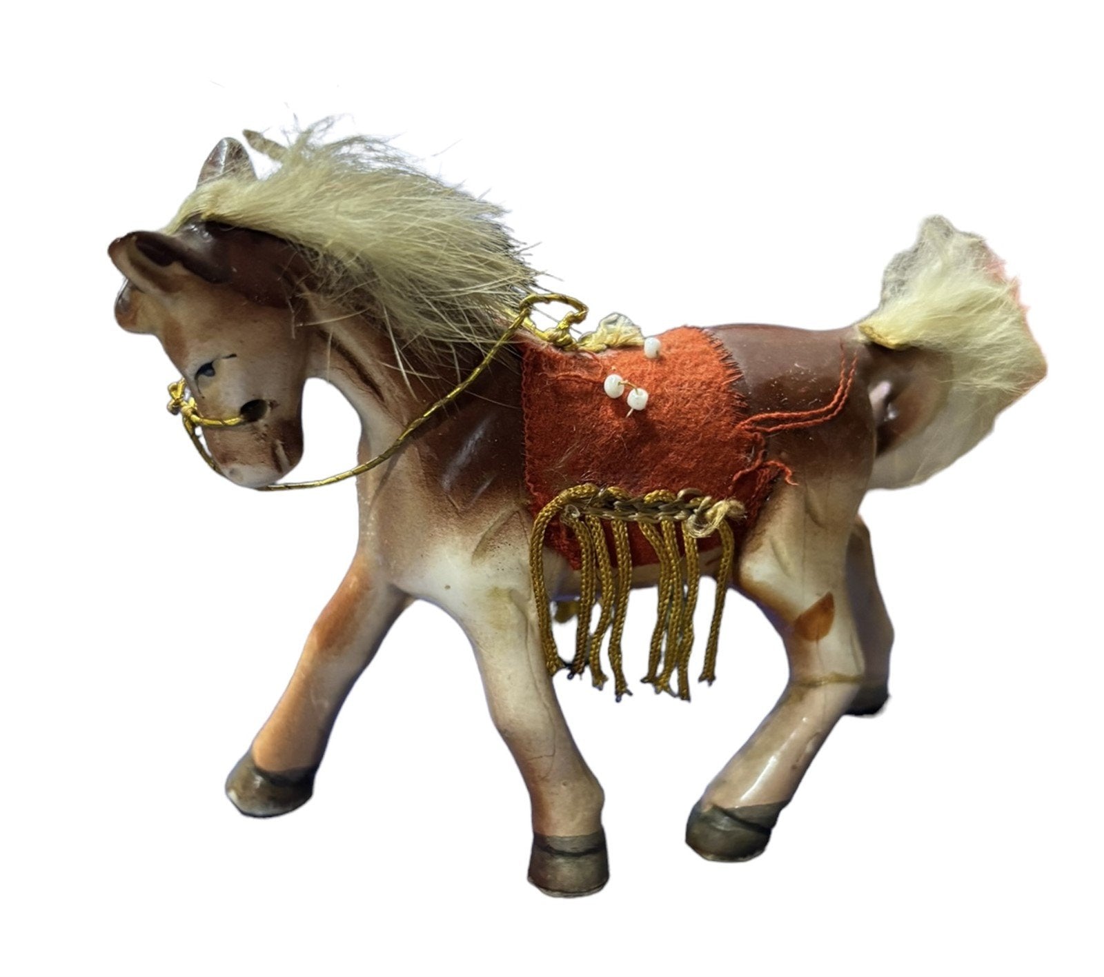 Cute pair of Bone China Horses. Each horse has a red saddle with gold fringe and seed beads. The mane and tail are made of rabbit fur, which is incredibly soft. These horses are in great condition and are so adorable! Made in Japan. They each measure 4" x 2.5" x 2".Take a look at the pictures for the best description. A photo is as good as a thousand words and is the best description of cosmetic condition. Use your ZOOM TOOL to best see this item! Please look closely at the photos for condition answers.