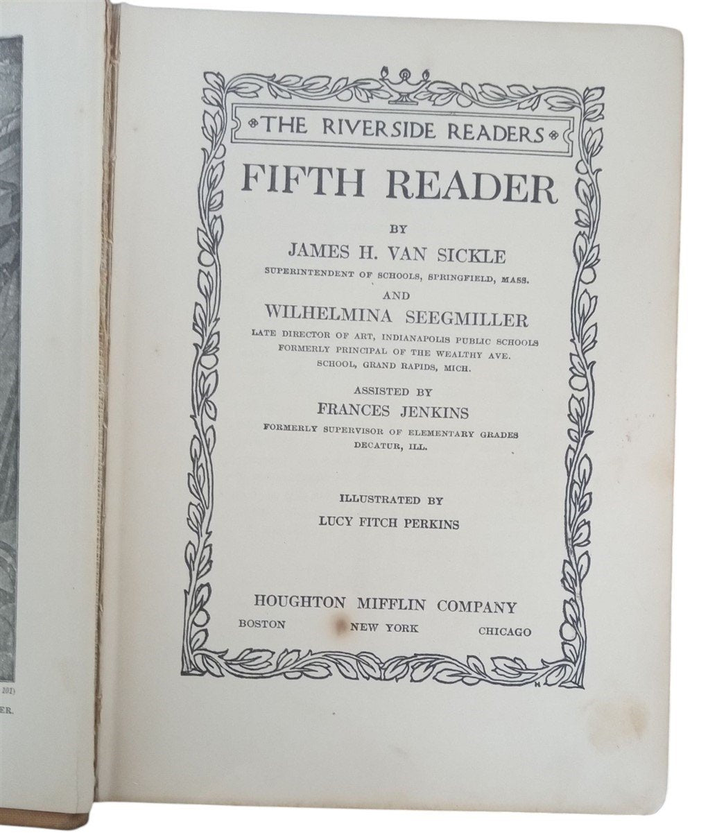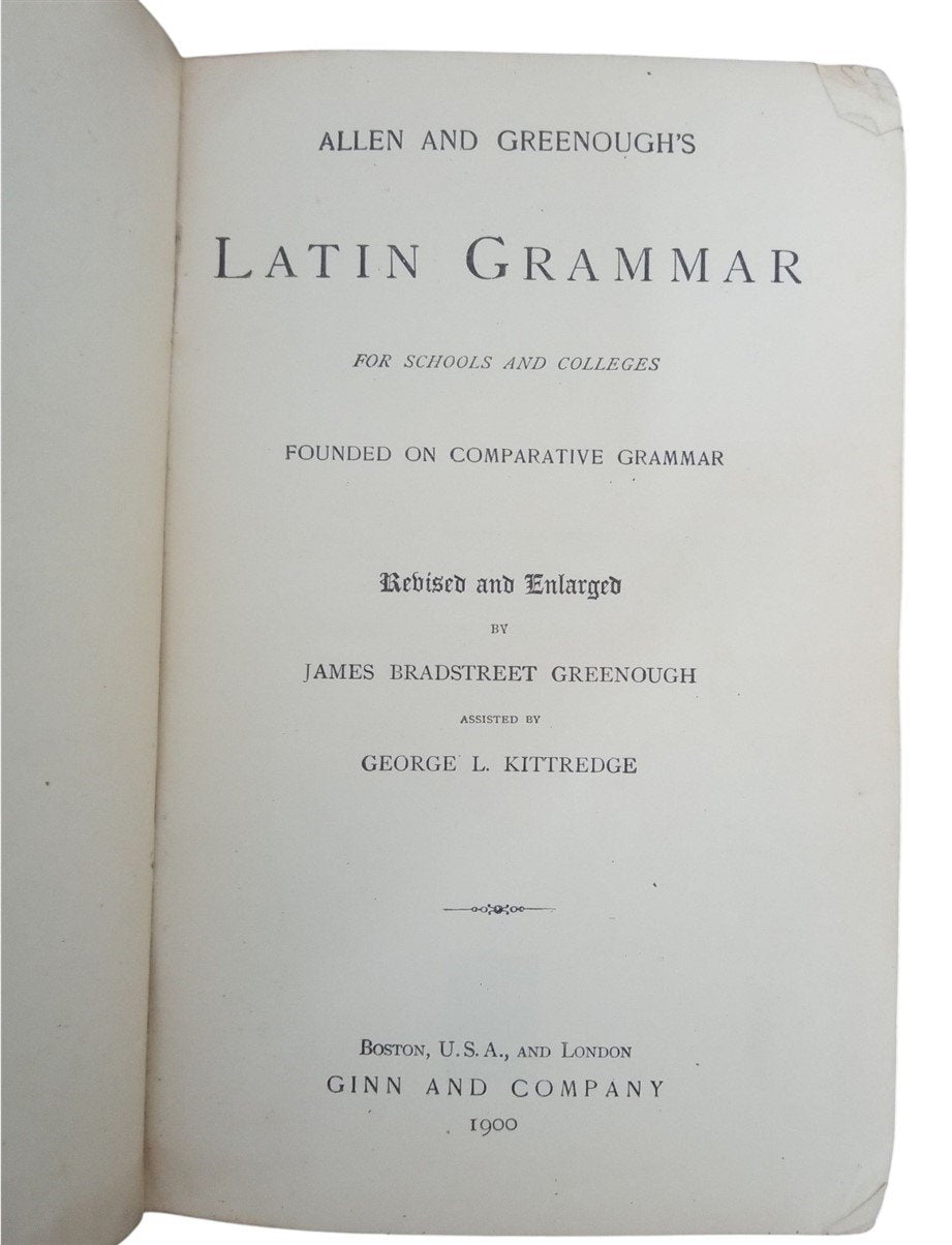 This is a set of antique books published between 1900 and 1912. Marks and stains are visible as well as writing and pencil marks on some pages. General wear from age is visible especially on the spine of each book. None of the books appear to be missing pages. This set is perfect for any aspiring collector and is great for any book collection or home library! The smaller books measure about 7" by 5" while the larger book measures about 8" by 6". This set includes Allen & Greenough's Latin Grammar (1900 though the copyright date reads 1888) Riverside Readers Fifth Reader (1911) Elson Grammar School Reader Book One (1912)