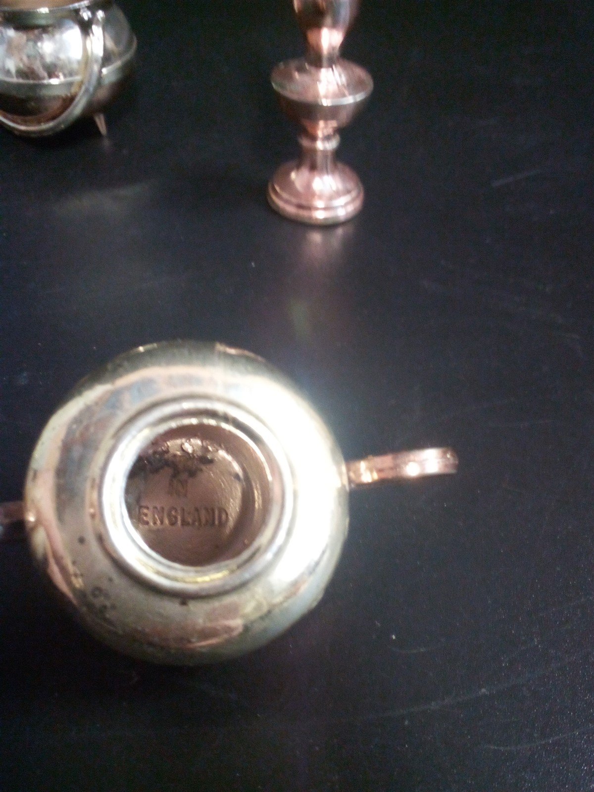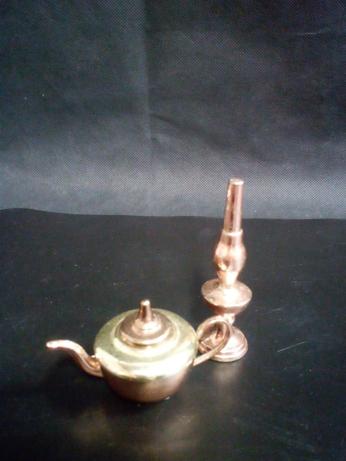 This is a charming set of miniatures cast in brass. It features a teapot (1" x 1.5"), a kettle (1.5" x !.5"), a carafe (1" x 1.5"), and a finial (3" x !.5"). The kettle and tea pot have fitted lids that are removable. The bottoms are stamped 756153 Made in England but would not read in pictures despite our best efforts. In the last photo if you zoom in you should be able to see the Made in England stamp on the inside of the tea pot. Take a look at the pictures for the best description. A photo is as good as a thousand words and is the best description of cosmetic condition. Use your ZOOM TOOL to best see this item! Please look closely at the photos for condition answers. We describe items as best we can and as we see them. Some details may be missed but not intentionally. Condition of an item is our opinion. If you have any questions on the condition of these items let us know before you purchase! Thanks for looking!-