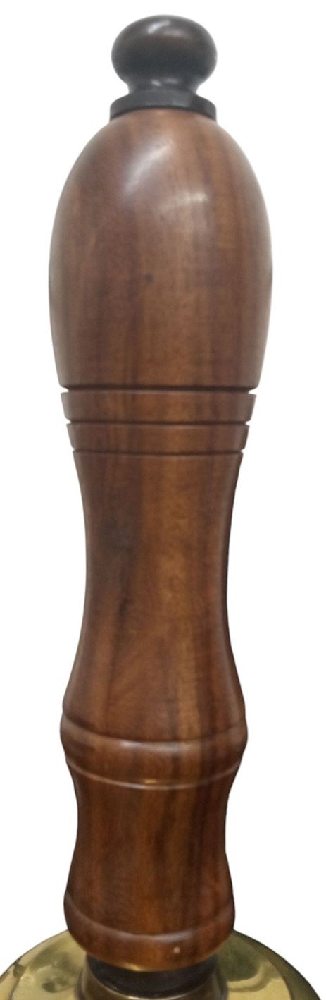 This is a reproduction commemorative Titanic brass bell likely made sometime before 2000. Some marks and scratches are visible. There is grime stuck between the grooves. This is a great item for any aspiring collector and makes a great conversation piece! Makes a unique decorative piece! This measures about 17" high by 8" wide