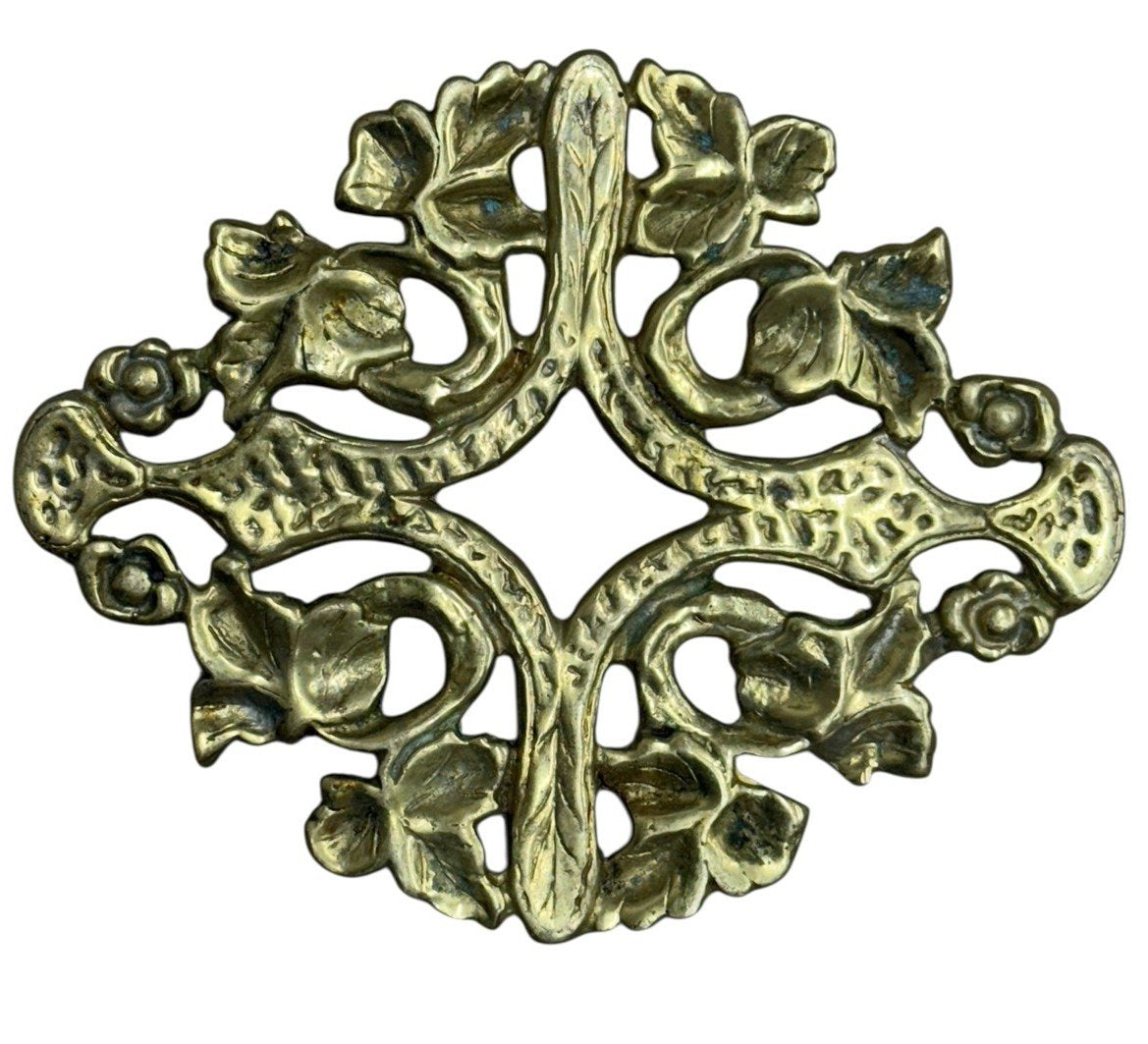 This is a brass trivet with a gold-tone and floral ivy pattern. It is in good condition with minor wear as seen in photos and measures 9" by 7." It would make a great piece to display anywhere!Take a look at the pictures for the best description. A photo is as good as a thousand words and is the best description of cosmetic condition. Use your ZOOM TOOL to best see this item! Please look closely at the photos for condition answers.
