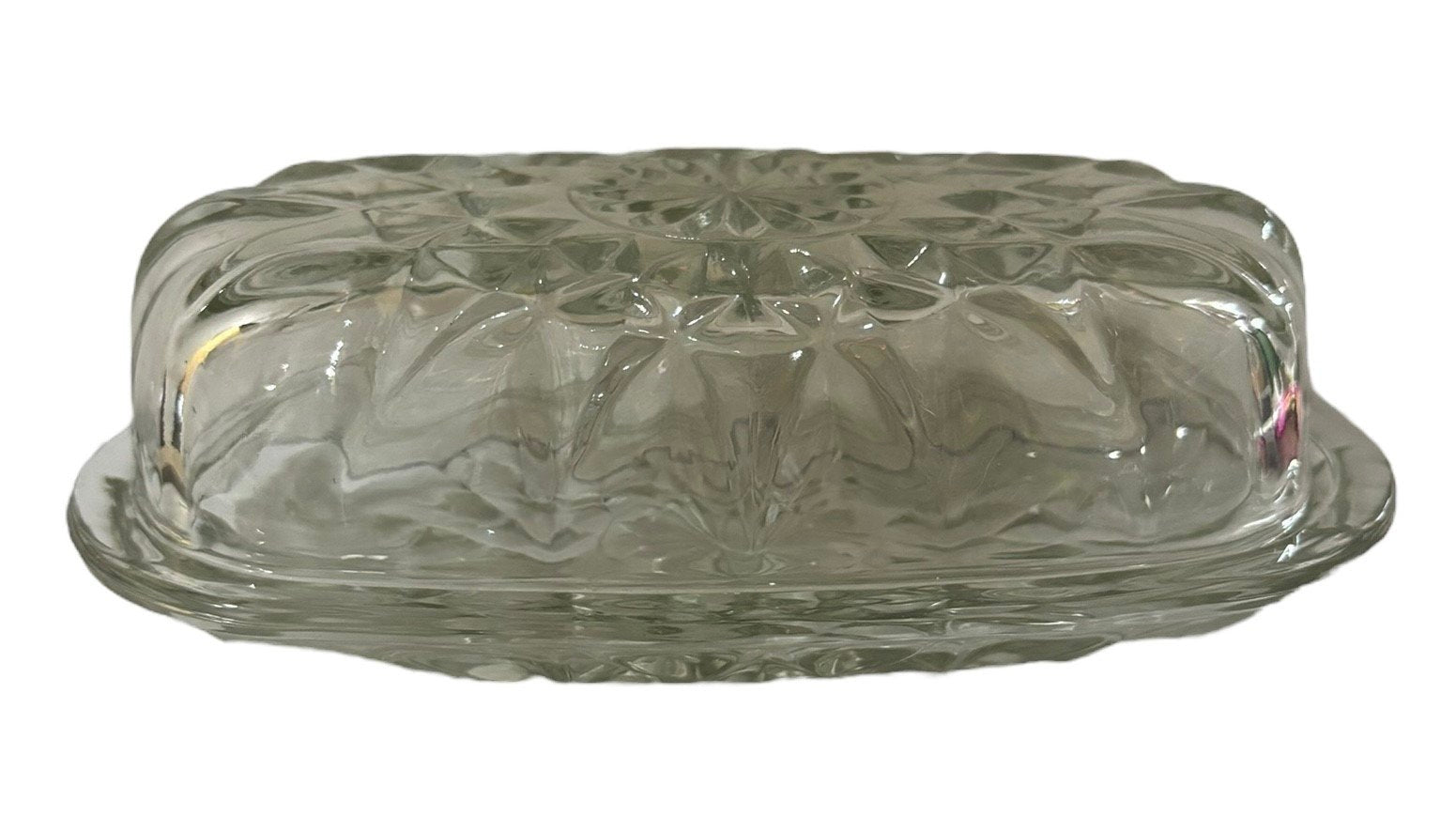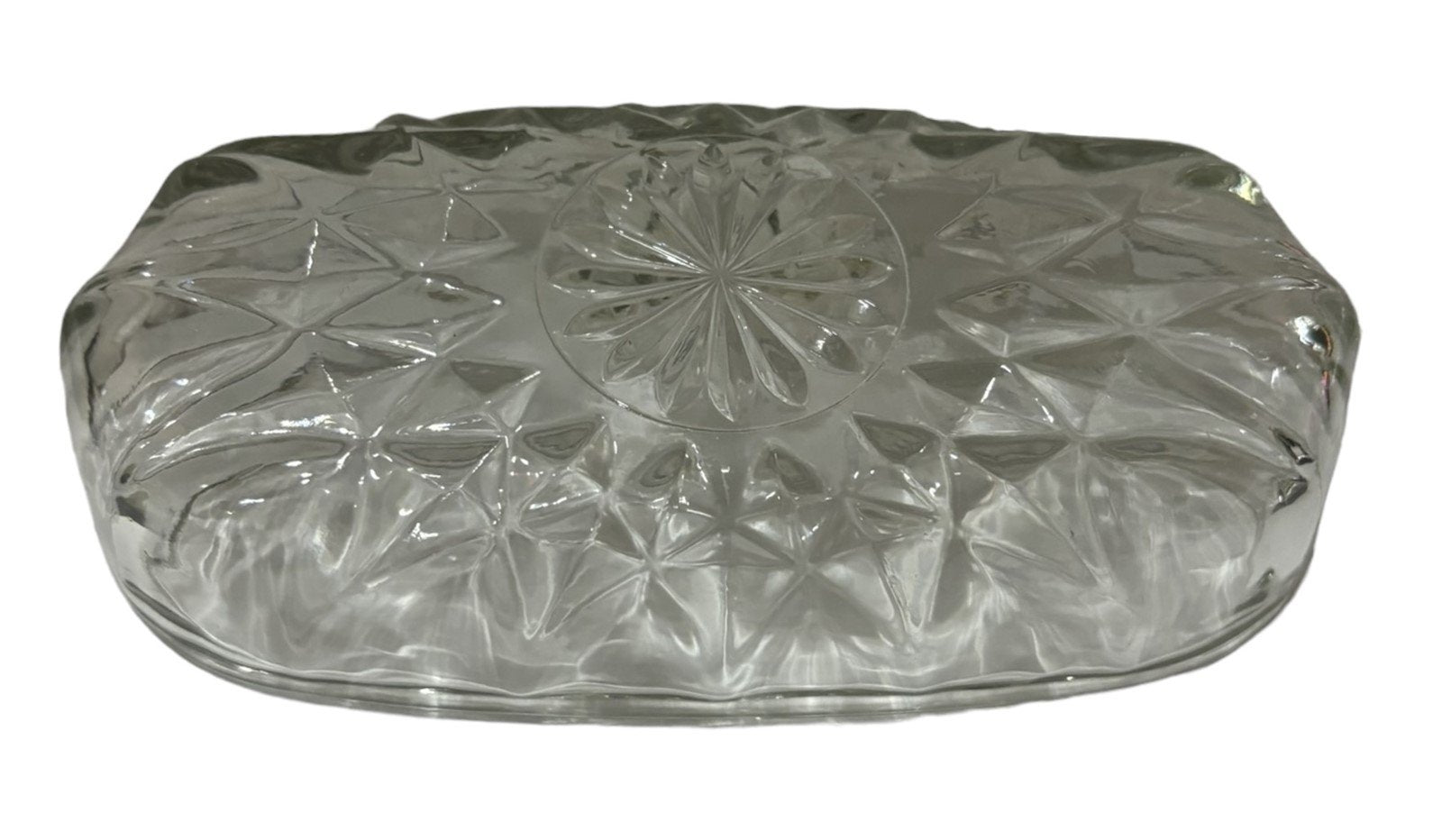 Beautiful Glass Butter Dish with Geometric Details and a Star Pattern. This dish is so gorgeous and can easily elevate a kitchen and dining room. A great way to spice up serving and dining! This dish measures 7" x 3.5" X 2.5". It is in amazing condition.Take a look at the pictures for the best description. A photo is as good as a thousand words and is the best description of cosmetic condition. Use your ZOOM TOOL to best see this item! Please look closely at the photos for condition answers.