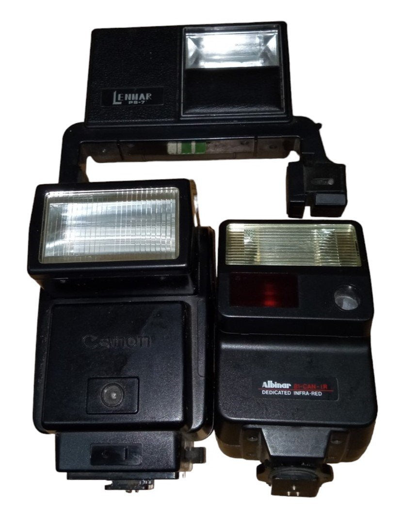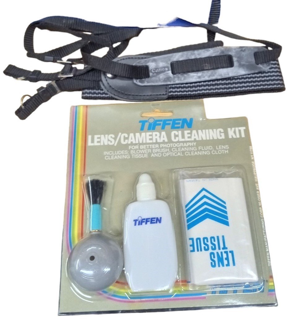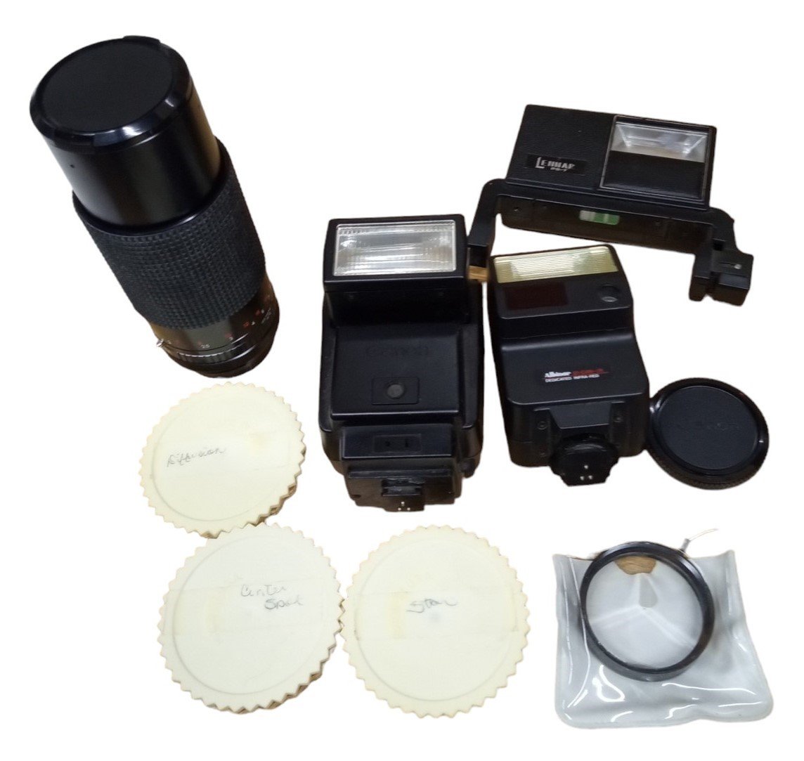 This is a set of camera accessories likely made around the 1980s. This set includes flashes,instructional materials,a bag and a lens. The bag has some very minor marks and stains. The scope and flashes show no visible damage. This is great for any aspiring collector and is perfect for any photographer! The bag measures about 10" by 6" by 8", the flashes measure about 3" by 3" by 4" each, and the scope measures about 2" by 2" by 7". This includes Nikon branded mounts as well as Tiffen branded lens filters. The lens has a 55 mm opening and an 80 to 200 zoom.