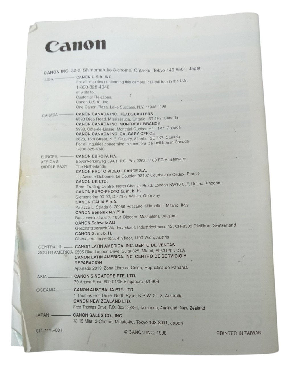 This is a Canon EOS IX Lite digital camera released in the 1990s. Marks and scratches are visible but this still appears to work with batteries. This is a great item for any aspiring collector and is a perfect fit in any camera or photography collection! The camera measures about 6" long by 5" wide, the manual measures about 6" long by 5" wide, and the strap measures about 30" long by 2" wide.