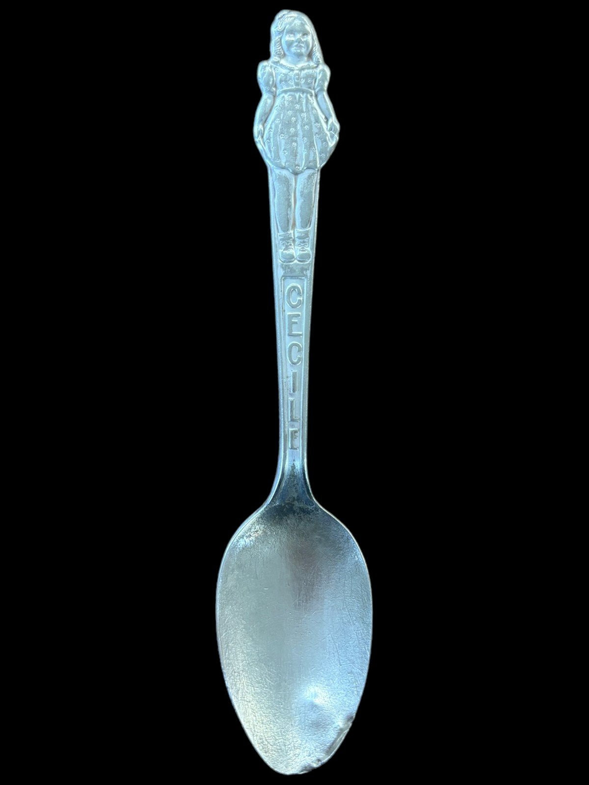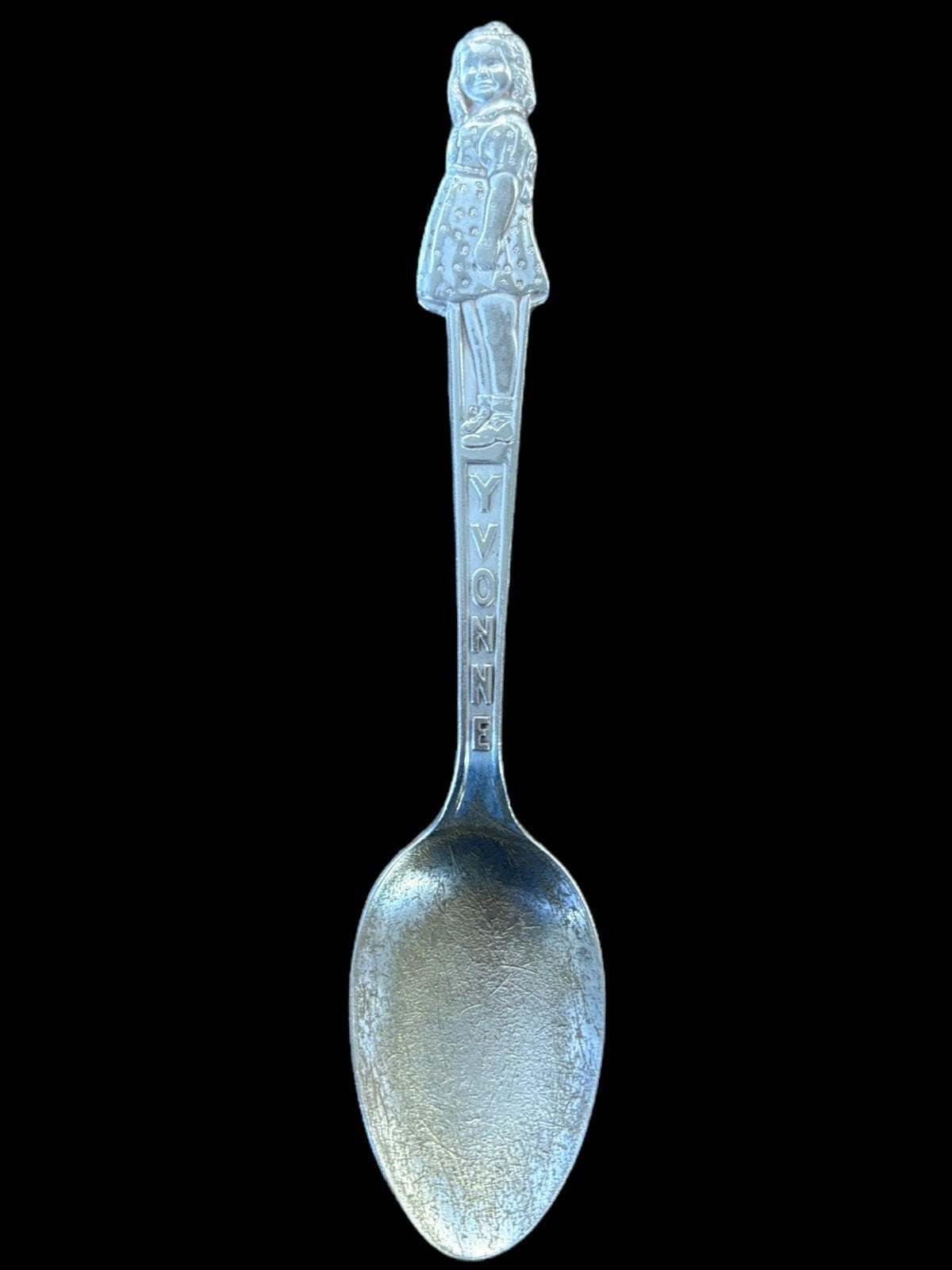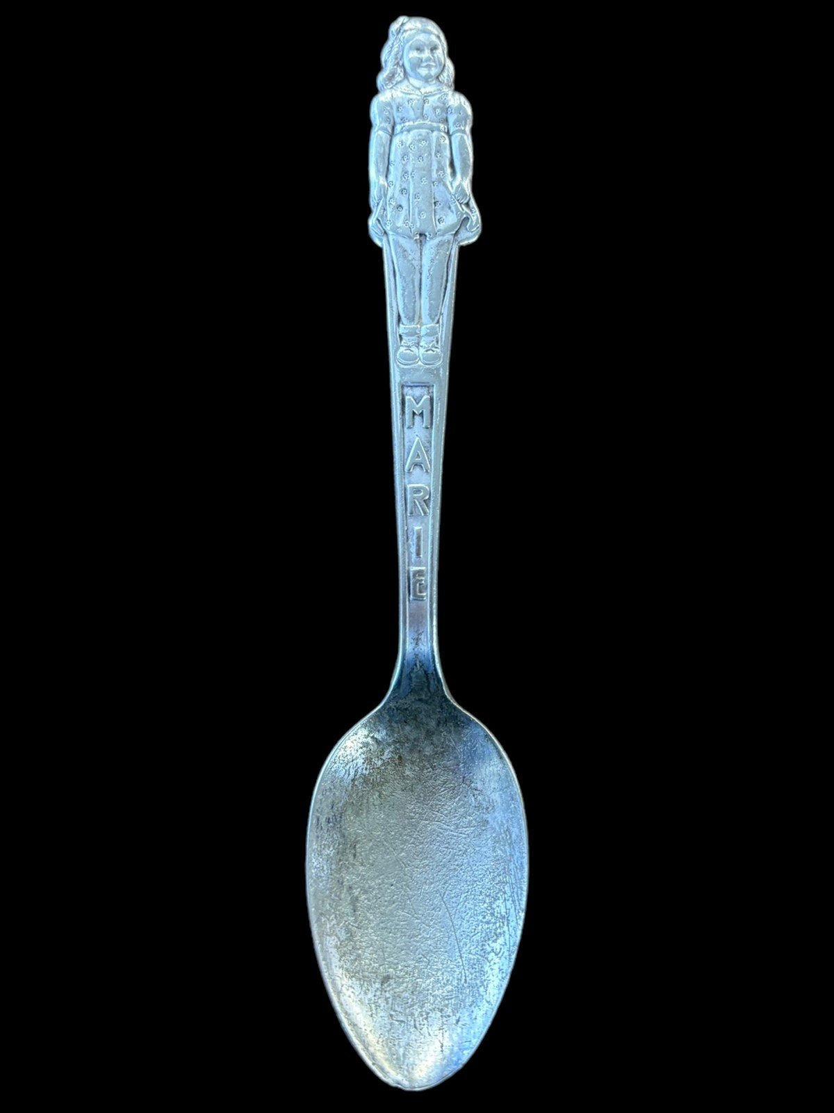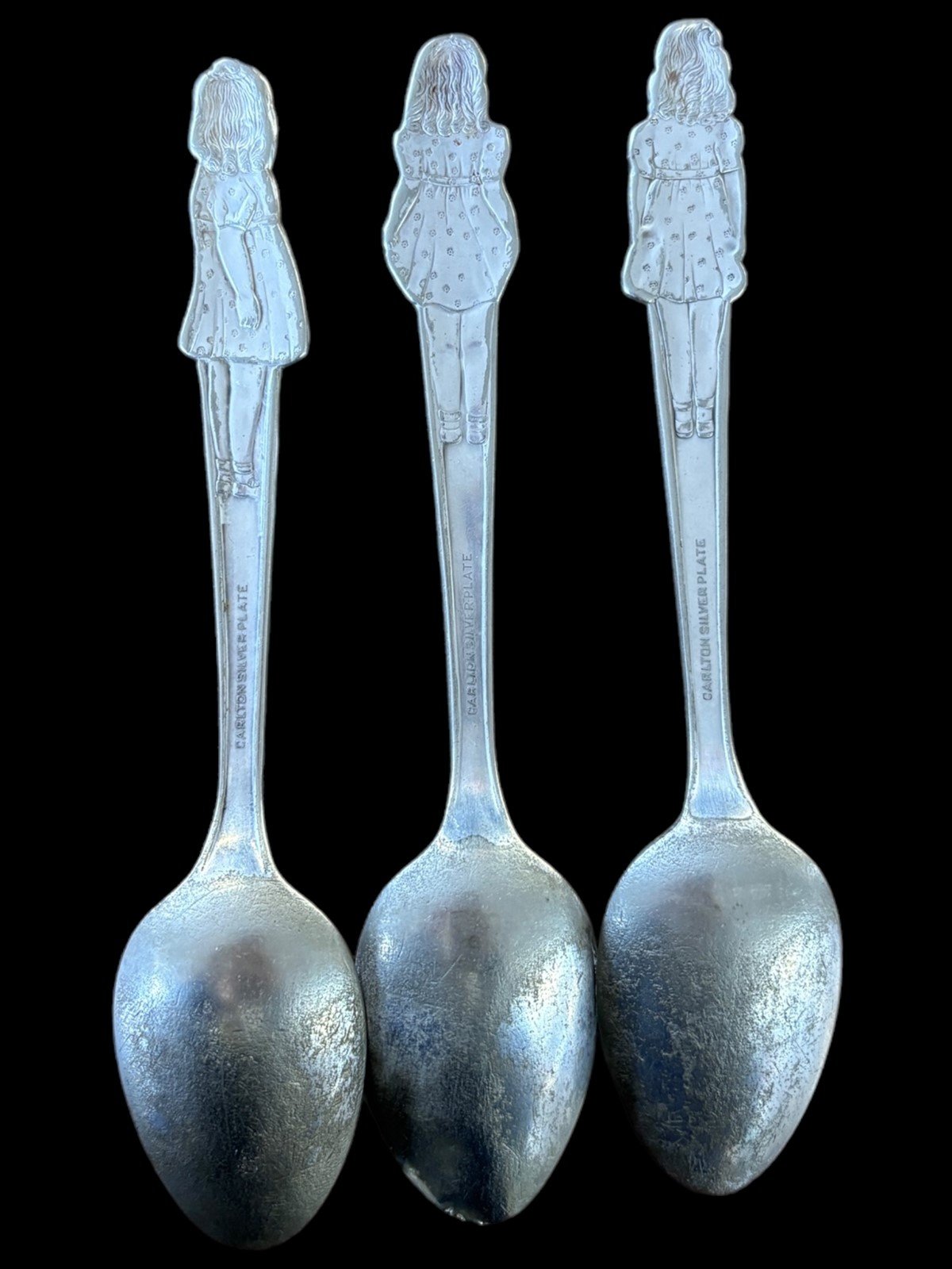 This is a set of 3 silver Carlton silverplate collectible spoons. They are in good condition. Each spoon has a girl on the top and is 6in long. There is a Marie, Yvonne, and Cecile.Take a look at the pictures for the best description. A photo is as good as a thousand words and is the best description of cosmetic condition. Use your ZOOM TOOL to best see this item! Please look closely at the photos for condition answers.