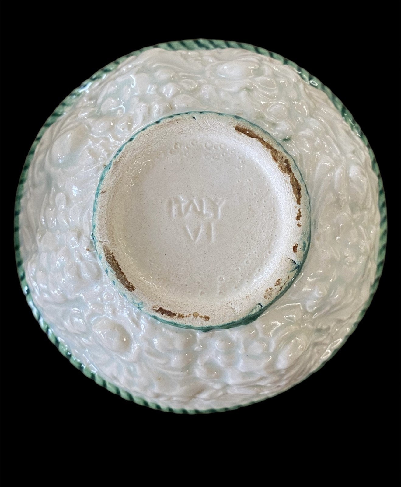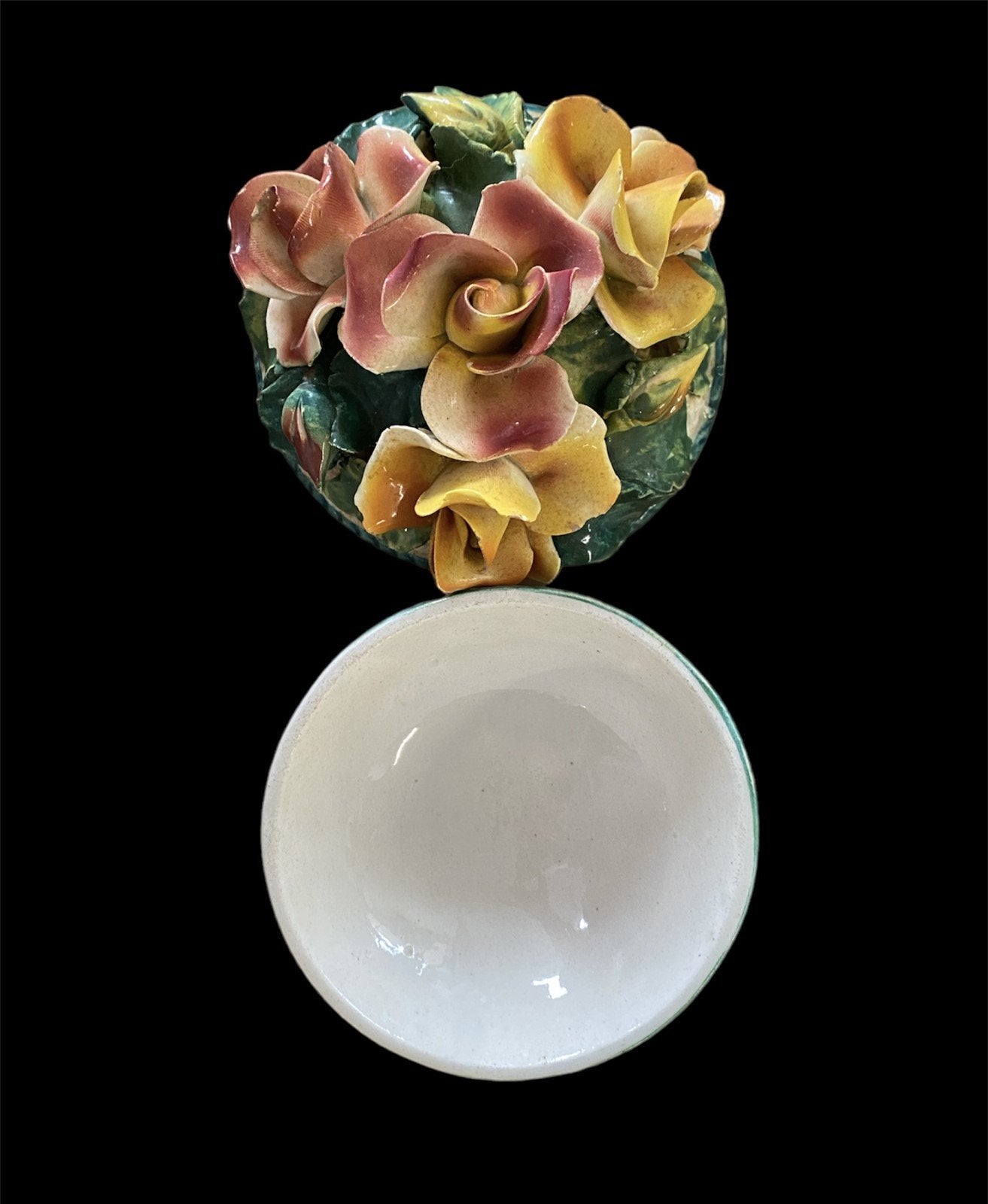 This small trinket box is beautiful addition to your dresser/room. Unbranded, just says Italy vi on the bottom. It's 5in x 5in x 4in. It has a diameter of 4 1/2in and a depth of 1 1/2in.Take a look at the pictures for the best description. A photo is as good as a thousand words and is the best description of cosmetic condition. Use your ZOOM TOOL to best see this item! Please look closely at the photos for condition answers.