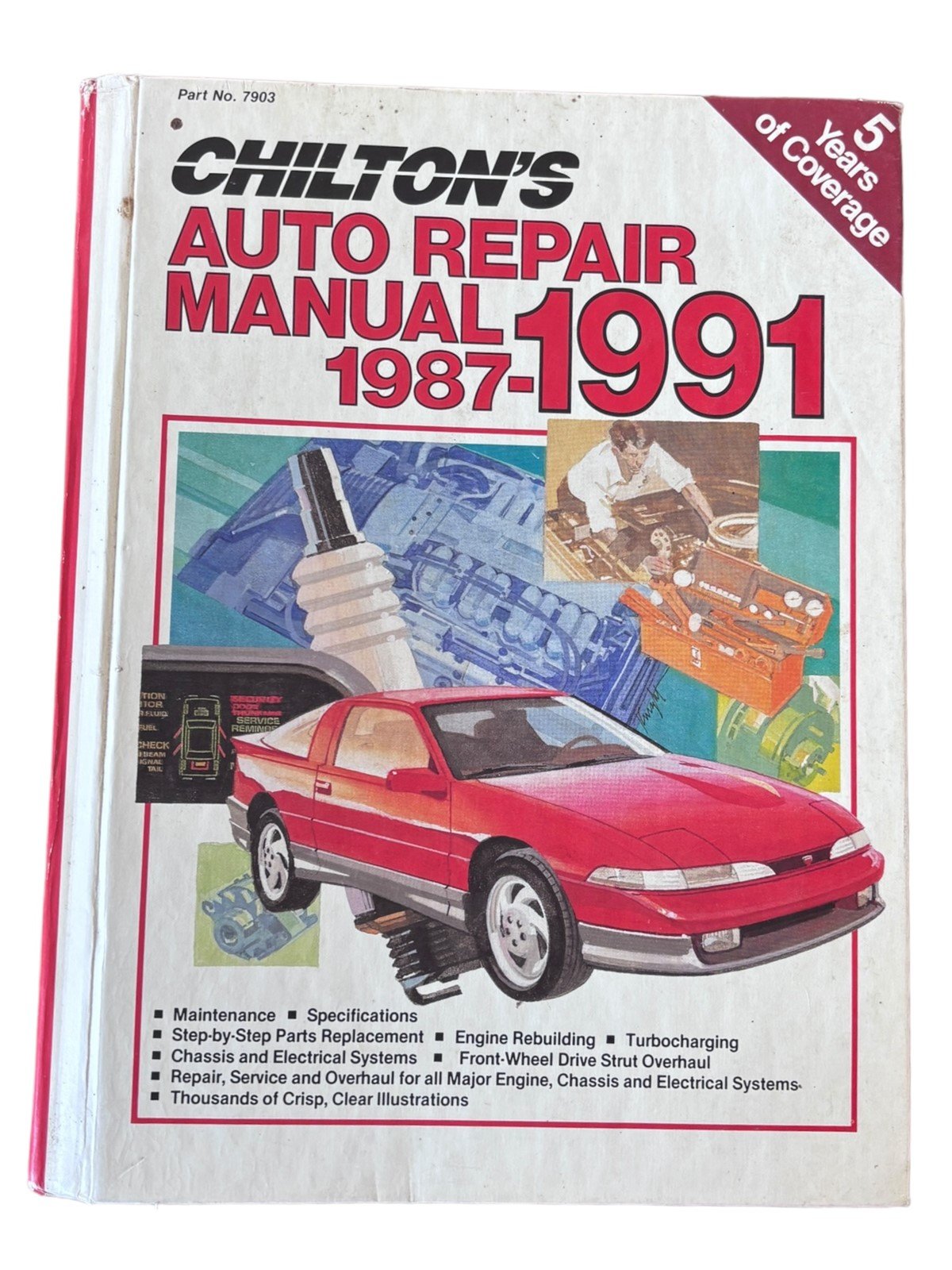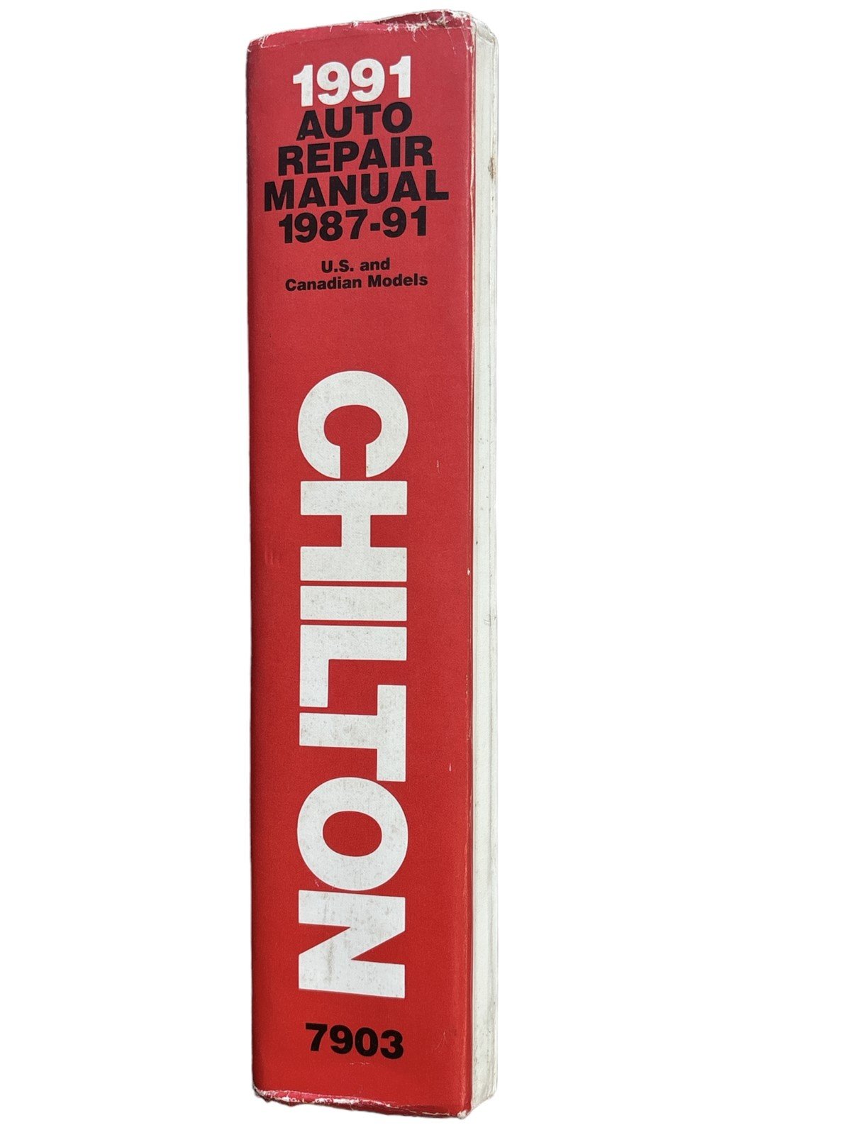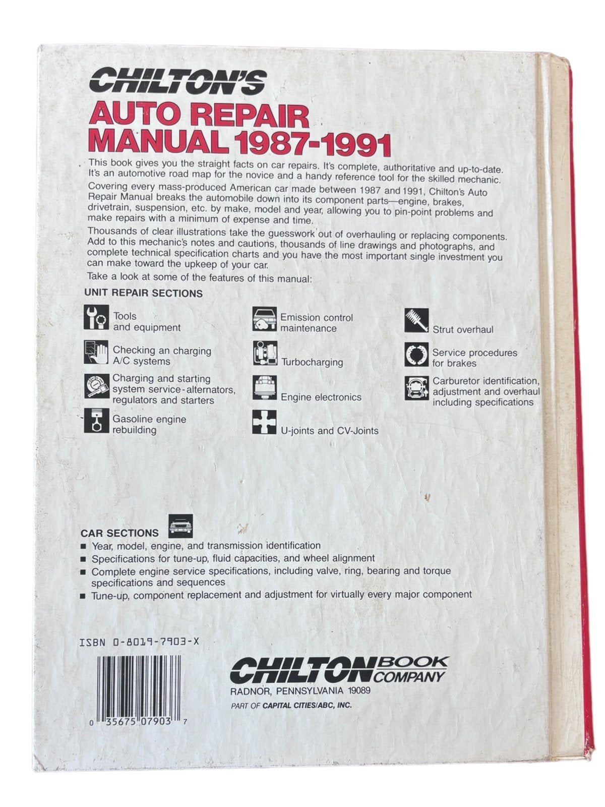 This is a Chiltons auto repair manual No. 7903 1987-1991. It's in great condition. It covers every mass produced vehicle between 1987- 1991. It measures 8 1/2in x 2 1/2in x 11 1/4in.Take a look at the pictures for the best description. A photo is as good as a thousand words and is the best description of cosmetic condition. Use your ZOOM TOOL to best see this item! Please look closely at the photos for condition answers.